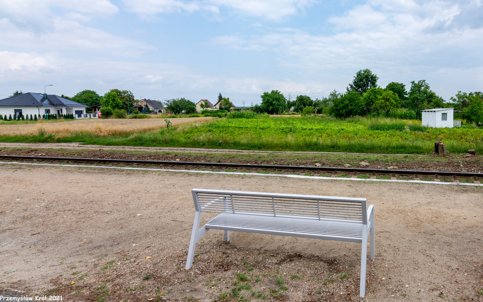 Dla wygody pasażerów na peronie zarządca zamontował ławkę i wiatę chroniącą przed opadami atmosferycznymi.