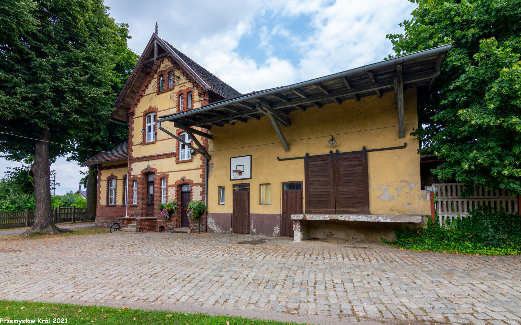 Budynek mieszkalny przy stacji (z nazwą stacji).