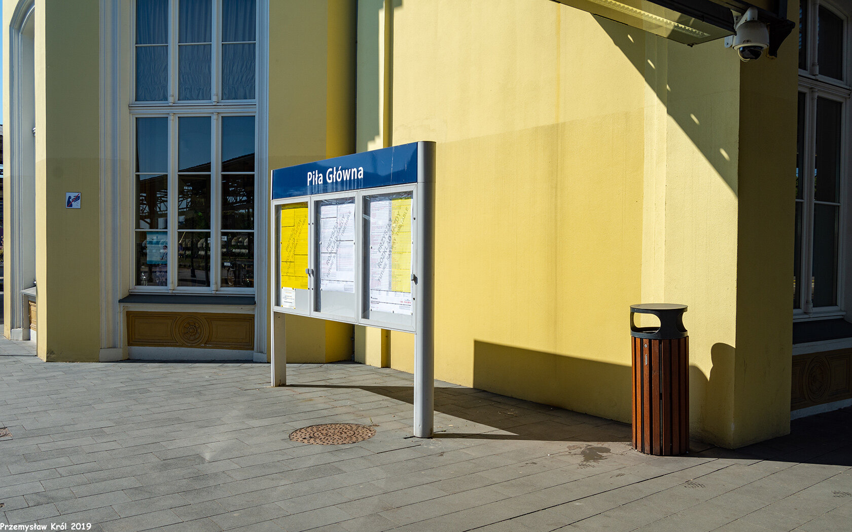 Tablica z rozkładem jazdy pod budynkiem dworca kolejowego w Pile.