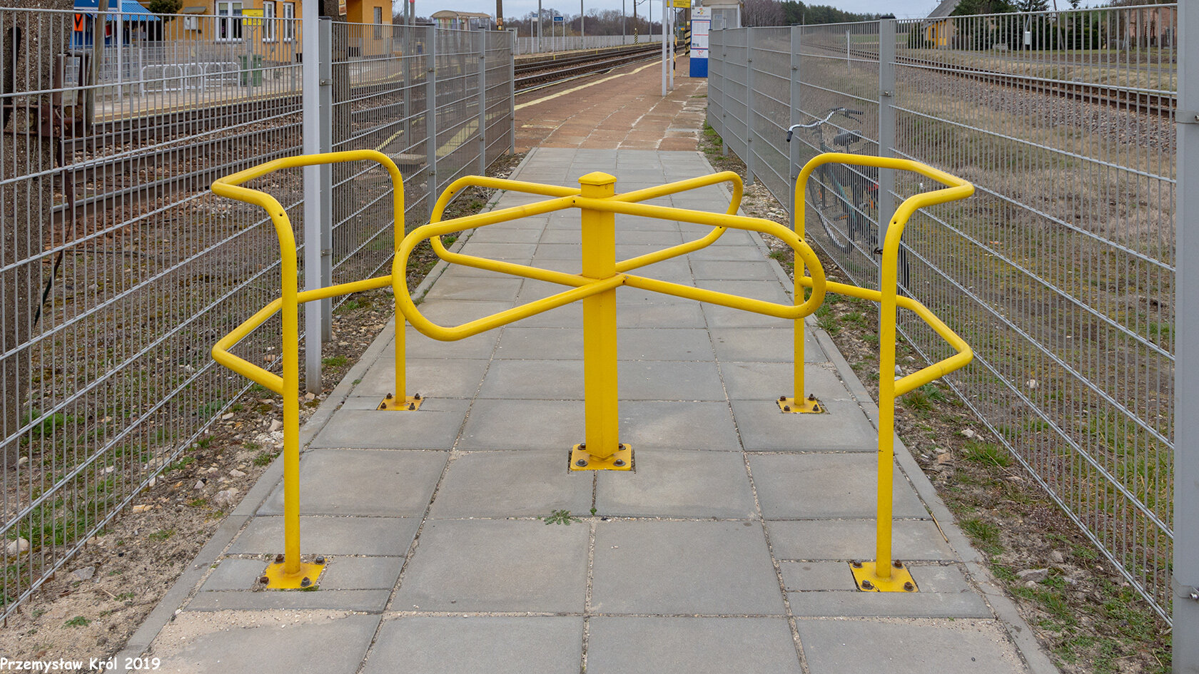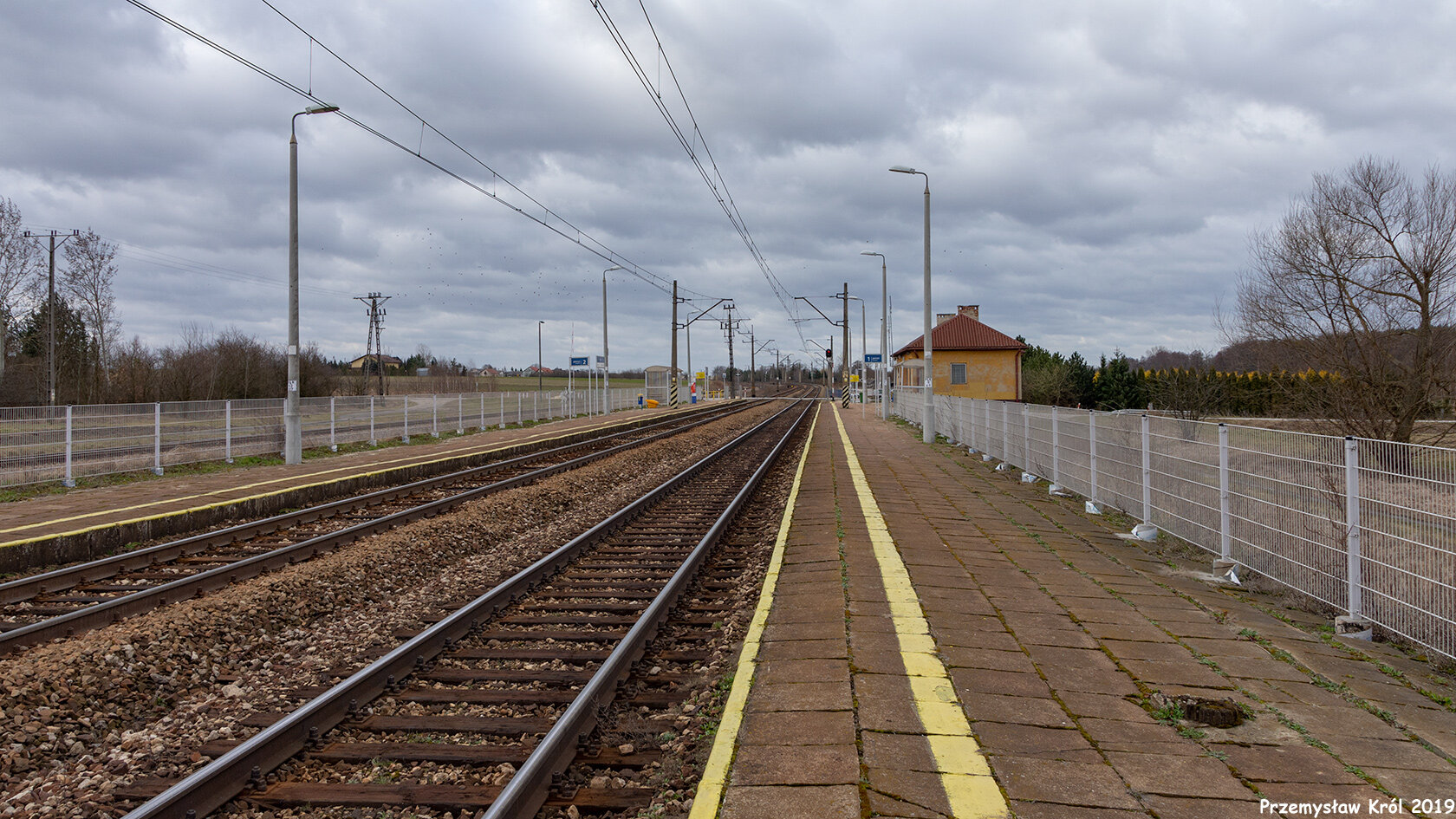 Pierwszy peron stacji, środkowa część, nie ma tu zbyt dużo elementów dla podróżnych (brak ławek, tablic informacyjnych).