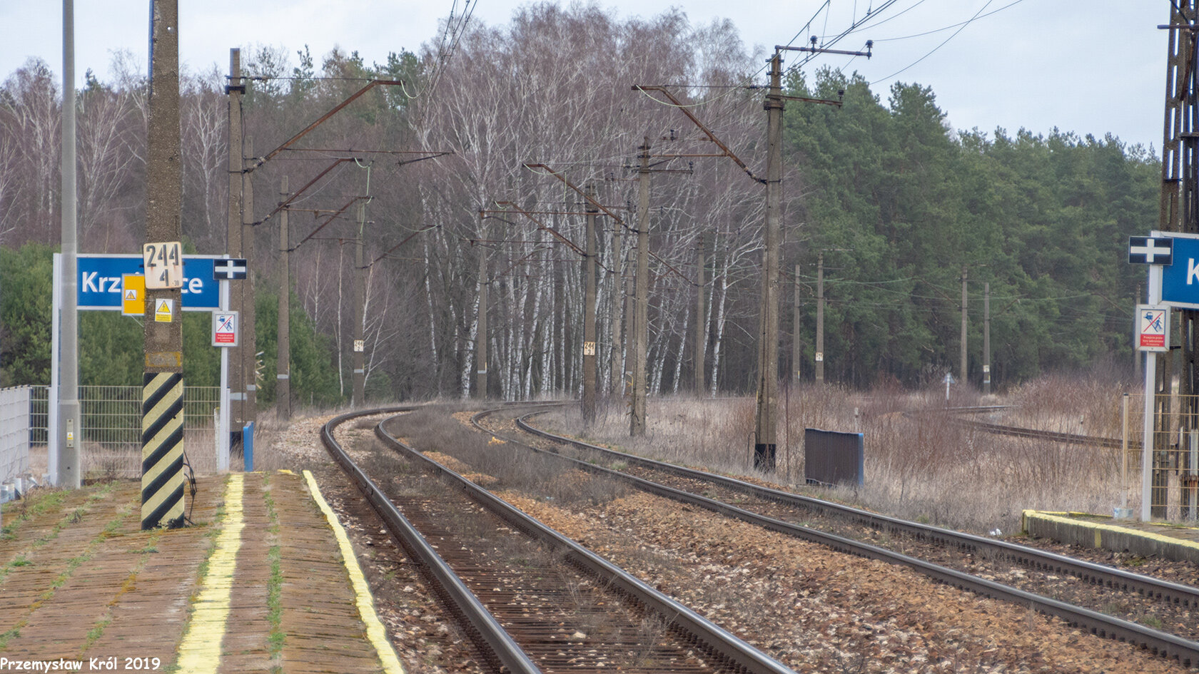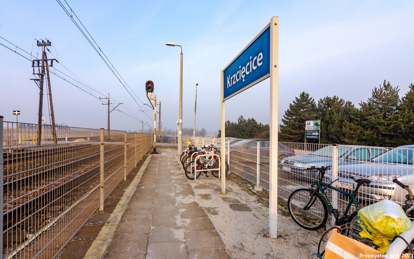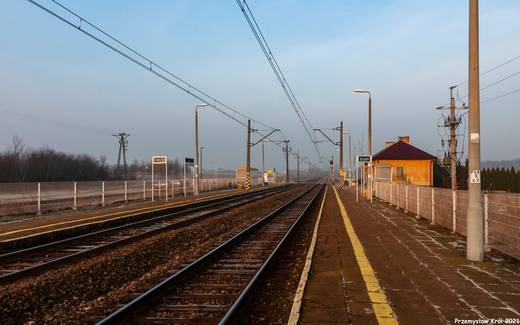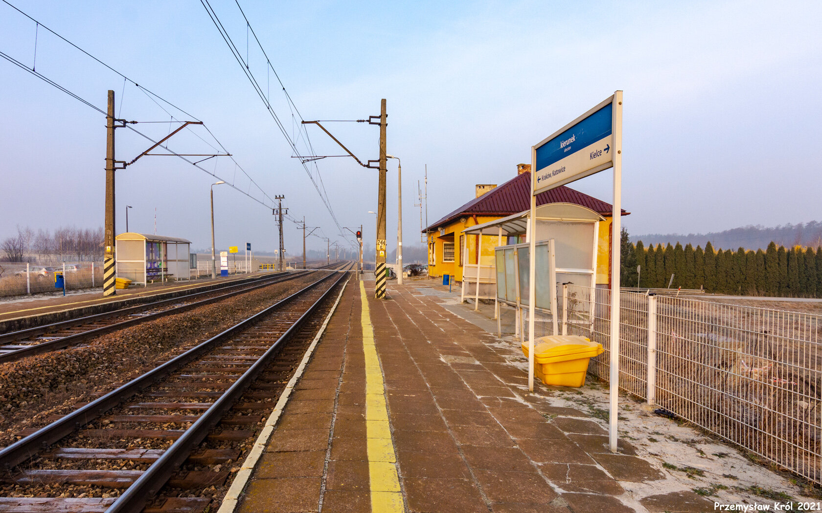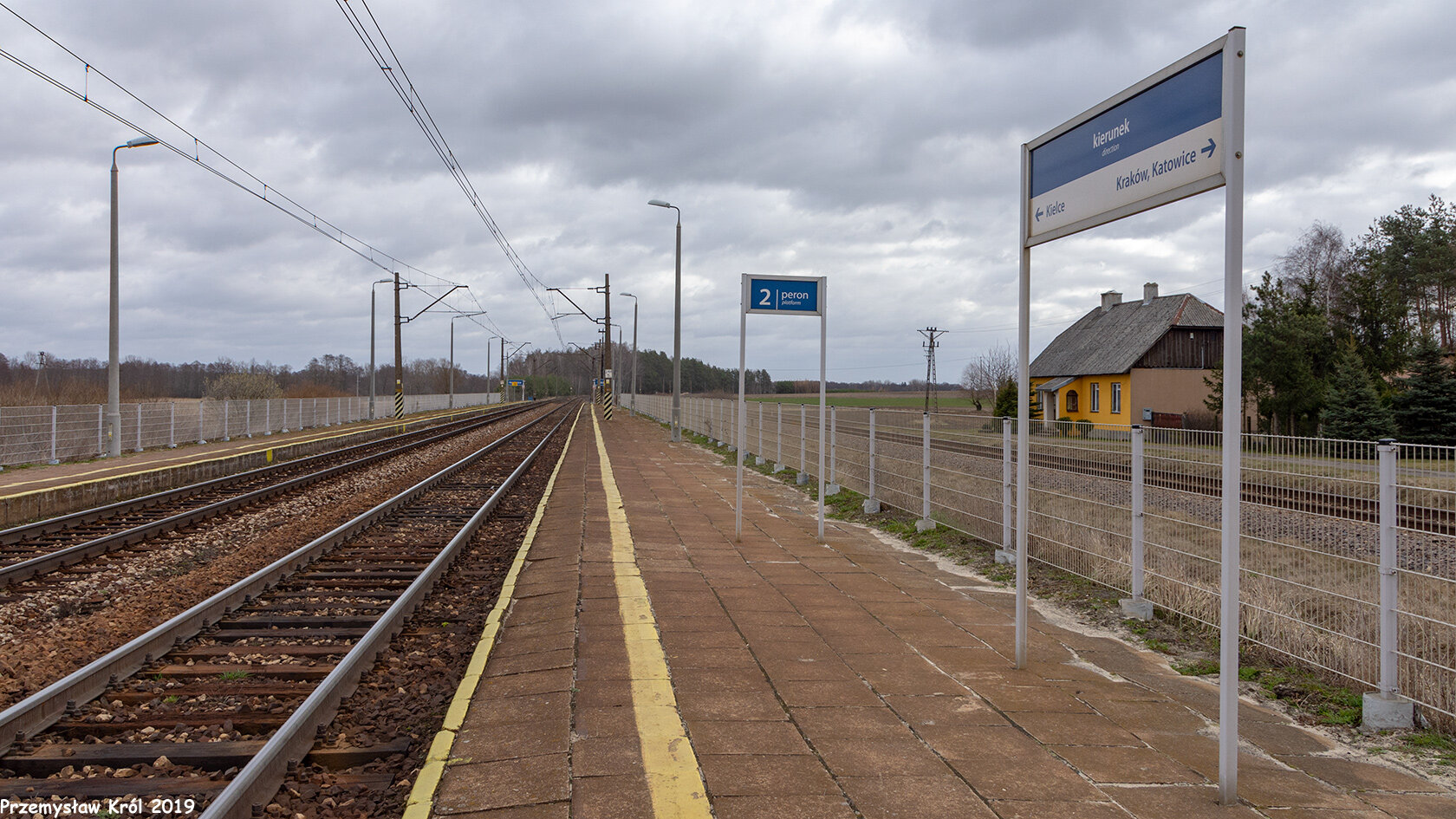 Drugi peron i tablica kierunkowa, na północny wchód pojedziemy do Kielc, na południowy zachód odjedziemy do Krakowa lub Katowic.