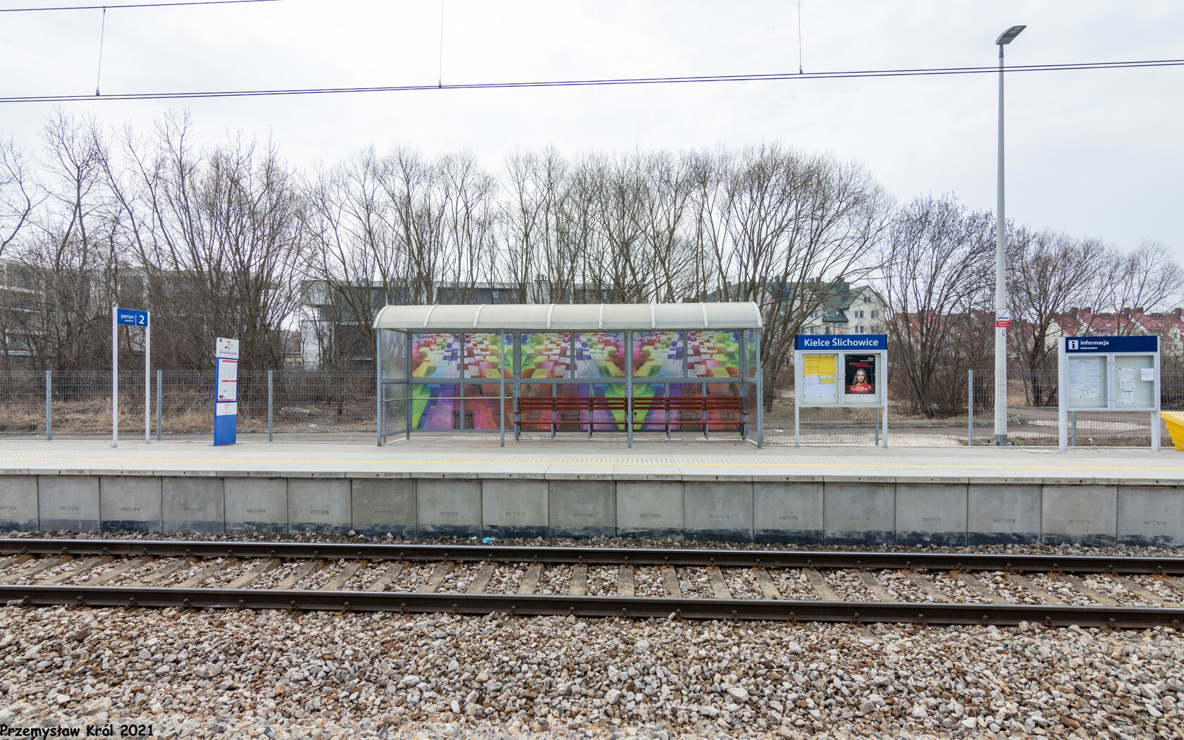 Kolorowa wiata peronowa oraz gablota z rozkładem jazdy przy pierwszym peronie.