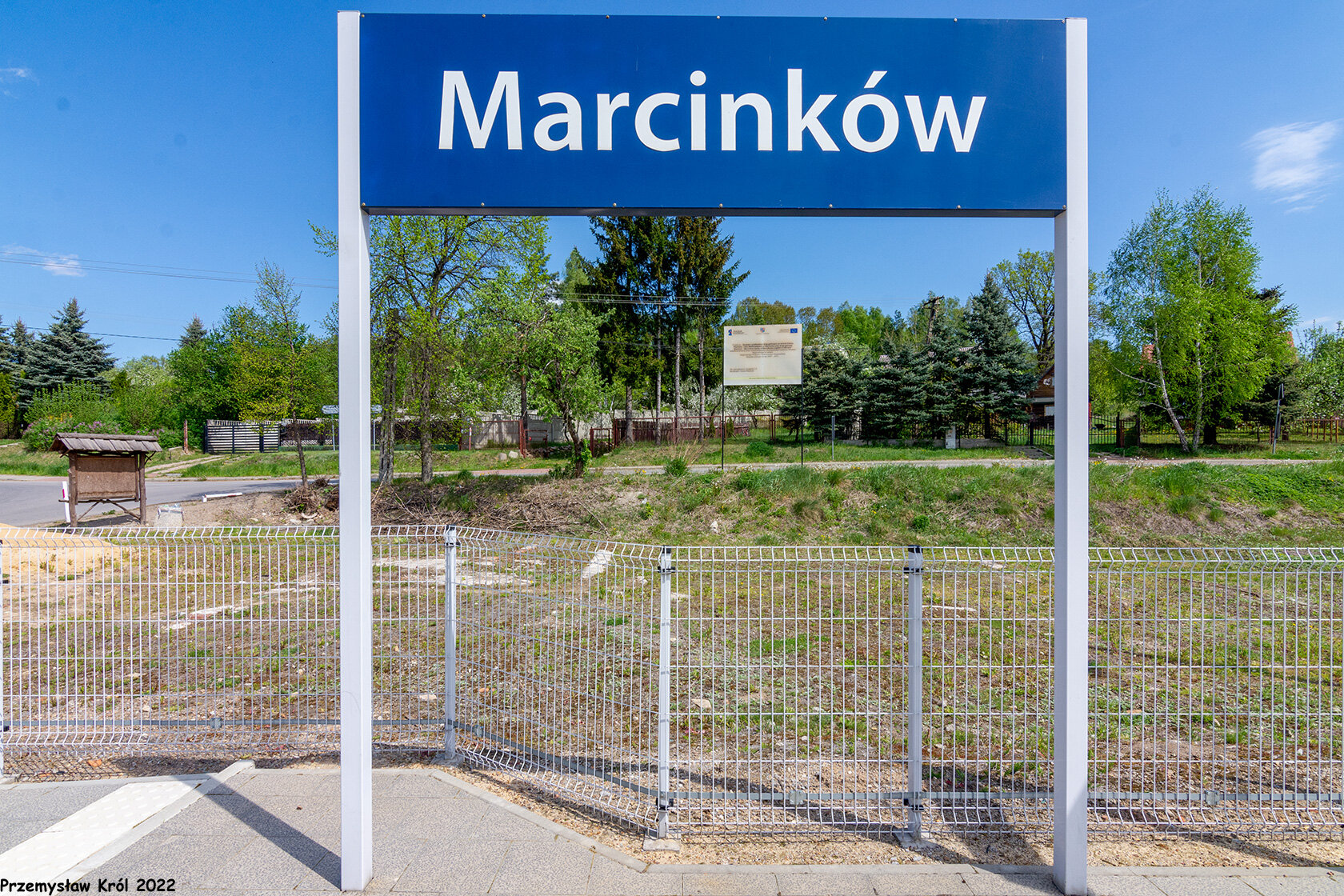 Mała tabliczka z nazwą stacji koło wiaty na drugim peronie, wiata niestety zniszczona przez wandali.