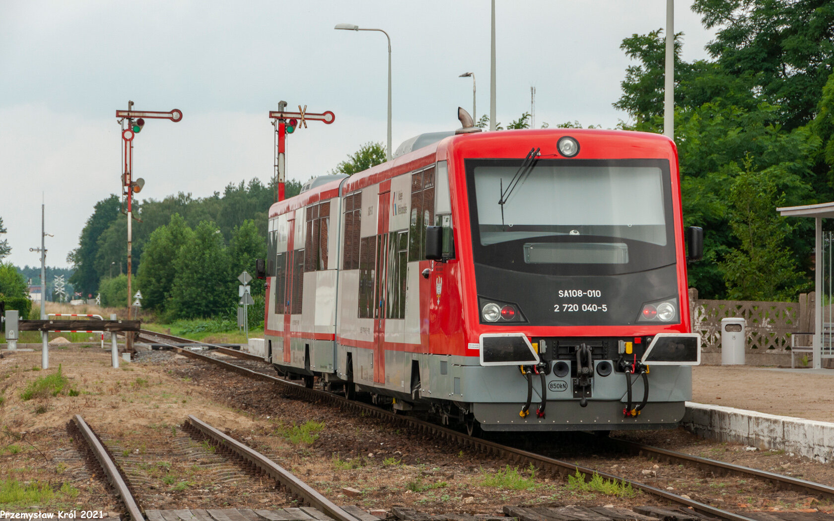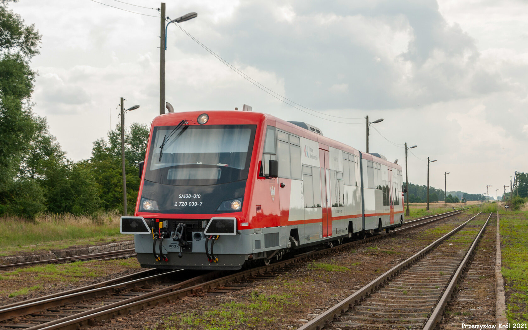 Dwuczłonowa jednostka typu SA108 prowadzi pociąg osobowy.