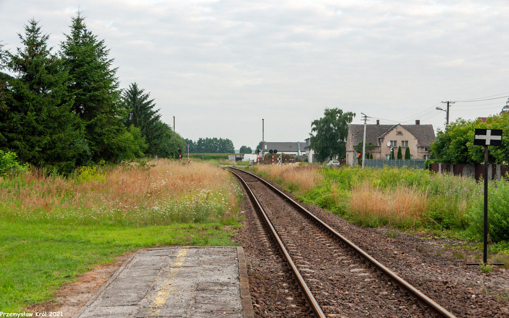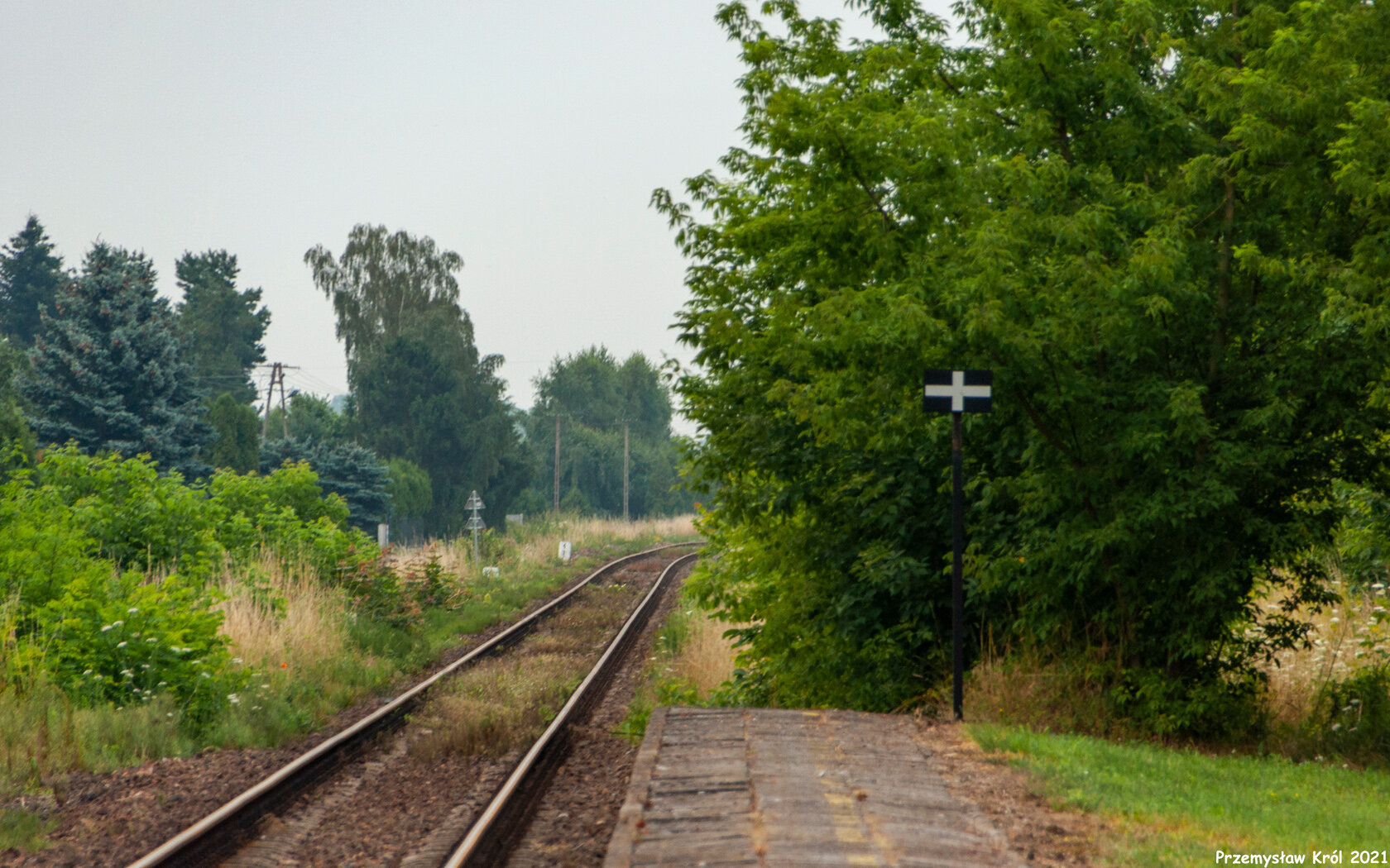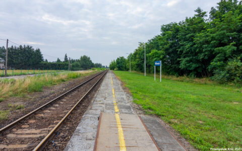 Droga dojazdowa do przystanku osobowego, w środku kadru widać znacznik W4 dla pociągów zatrzymujących się jadąc w stronę Sokółki.