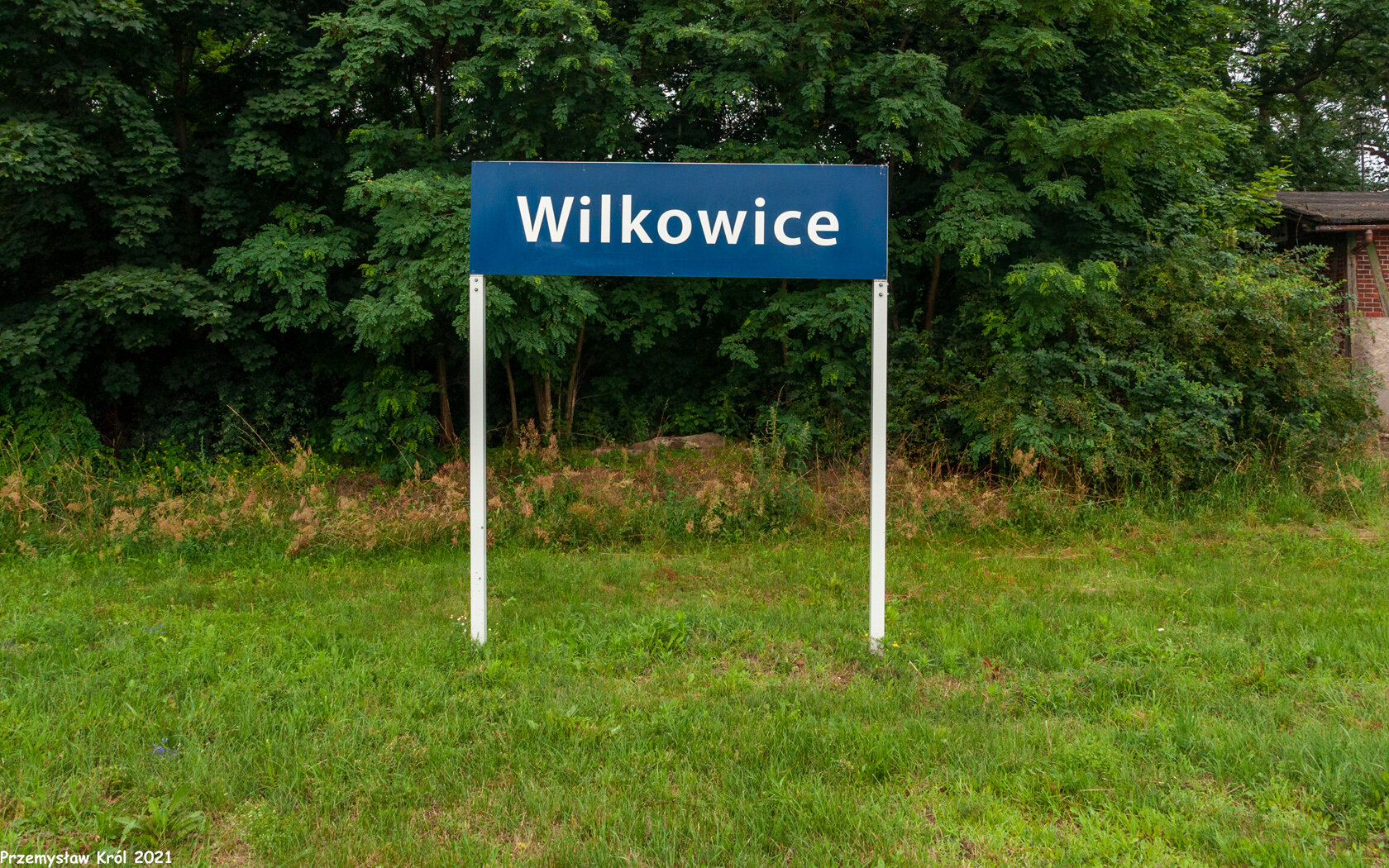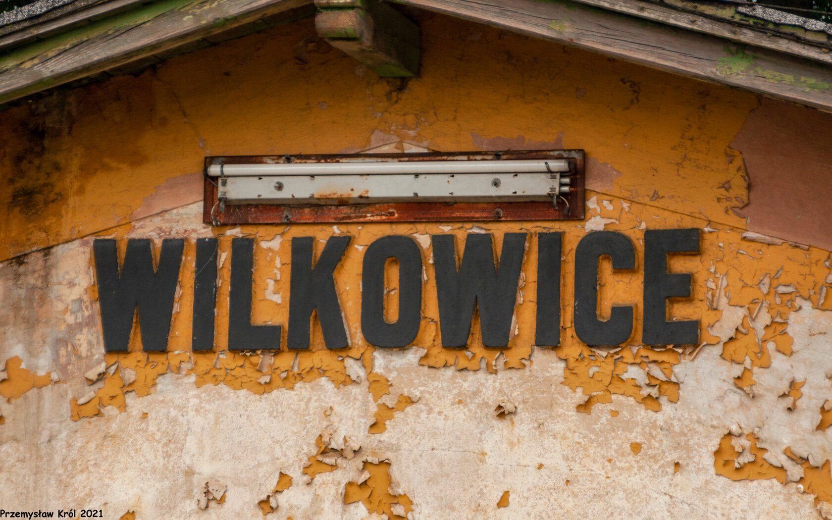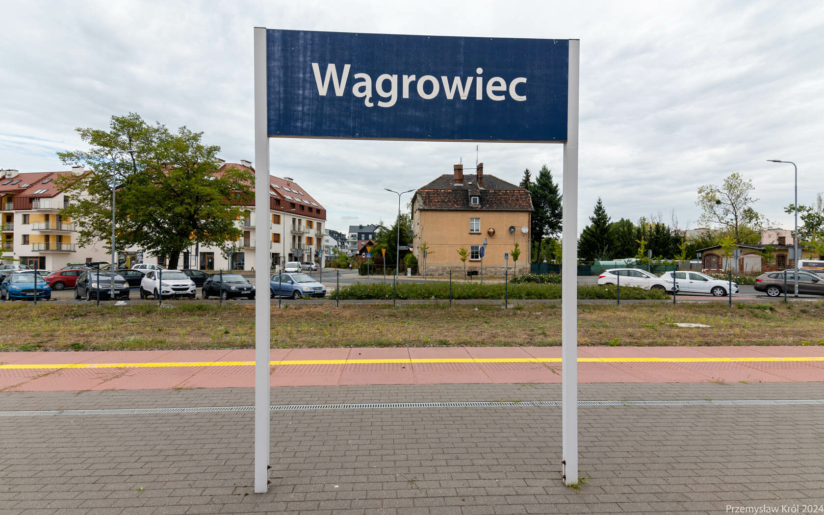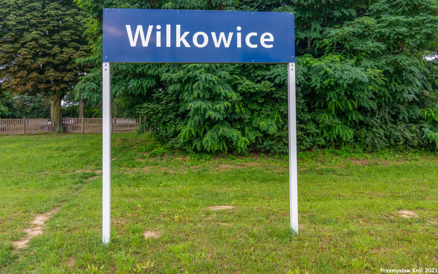 Mała tabliczka z nazwą stacji, ujęcie w kierunku wyjścia z peronu.