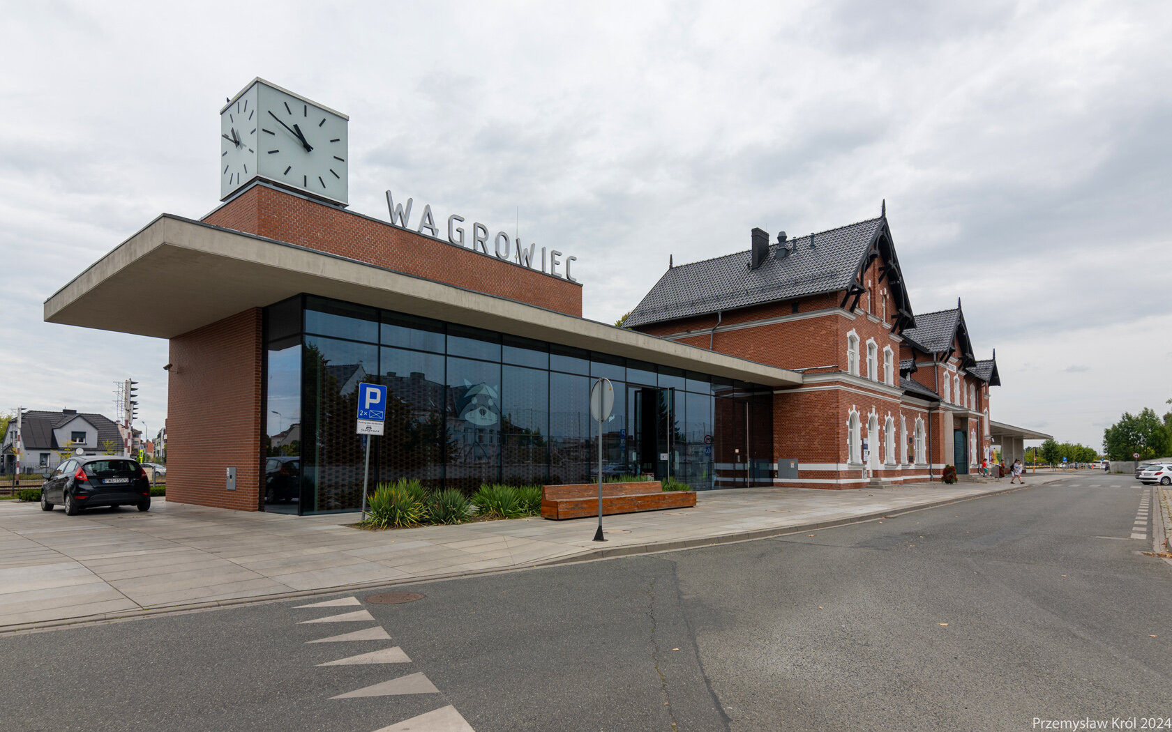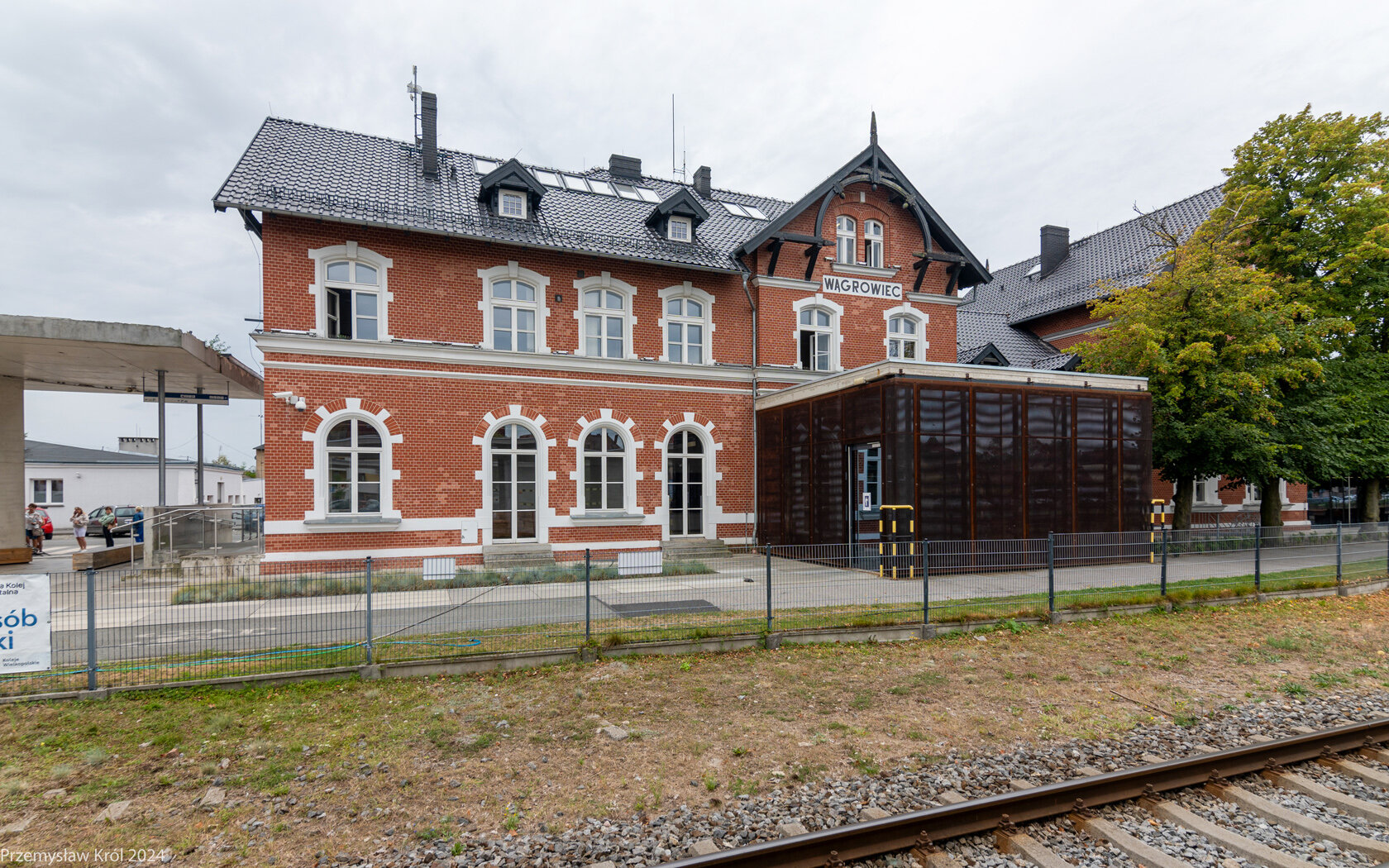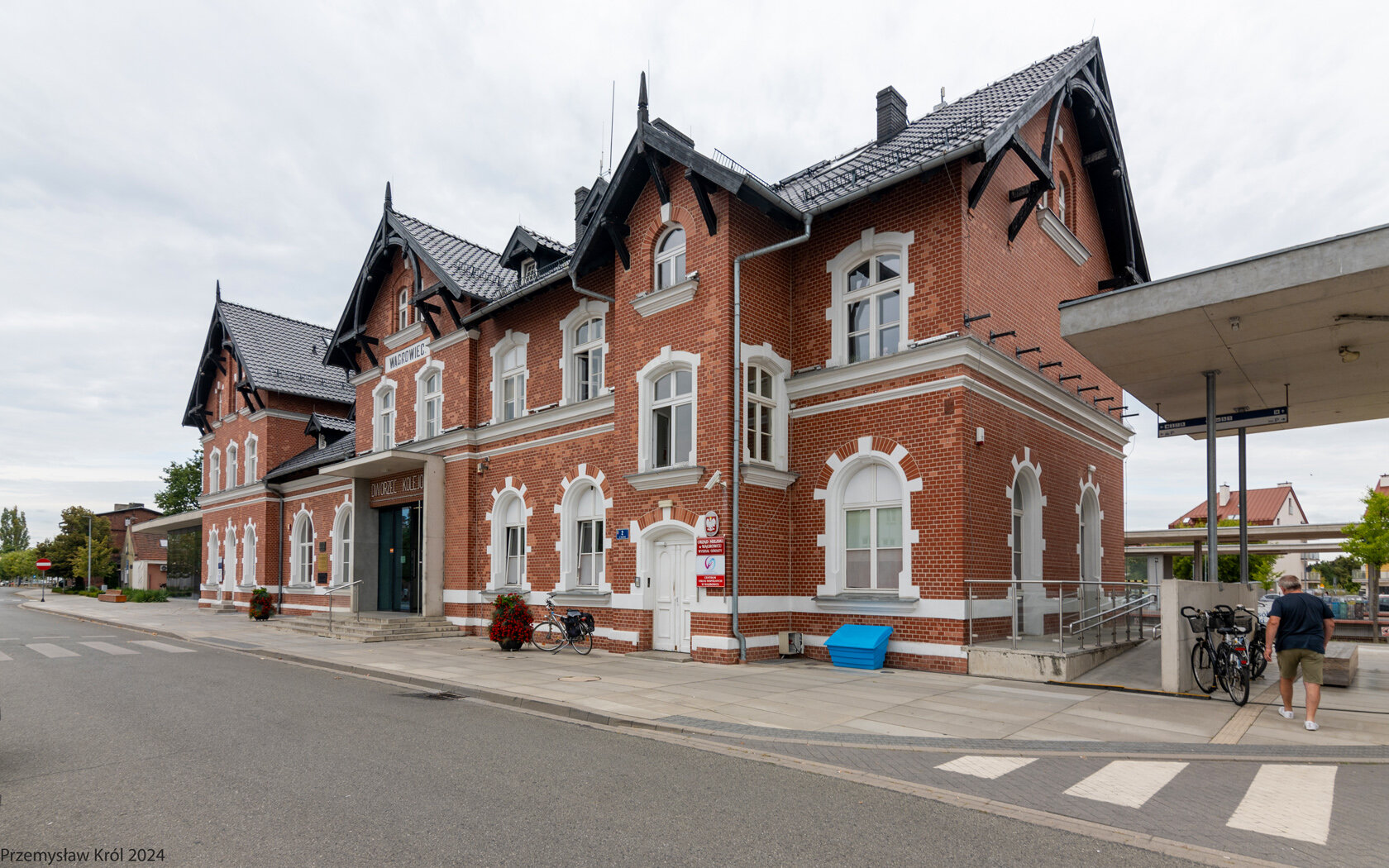 Kadr na budynek dworca oraz nastawni od strony torów.