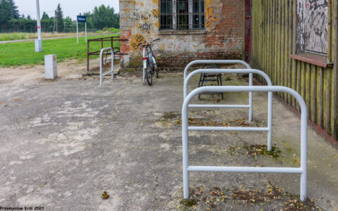 Tu kiedyś była stacja z bocznicą kolejową, na ujęcie pozostałości po rampie załadunkowej.