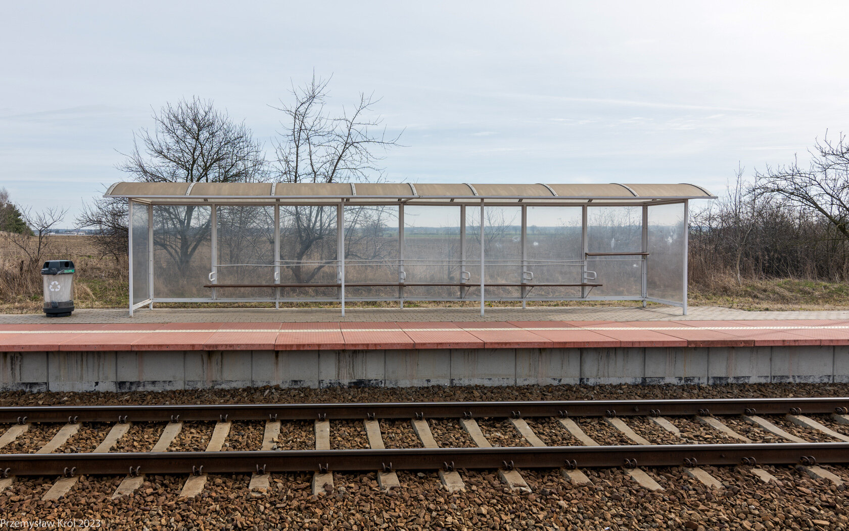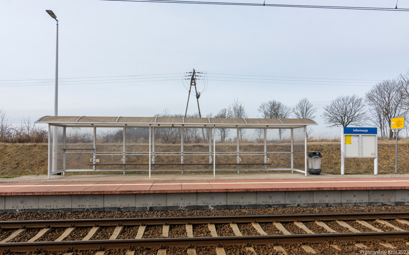 Duża wiata pasażerska na drugim peronie.