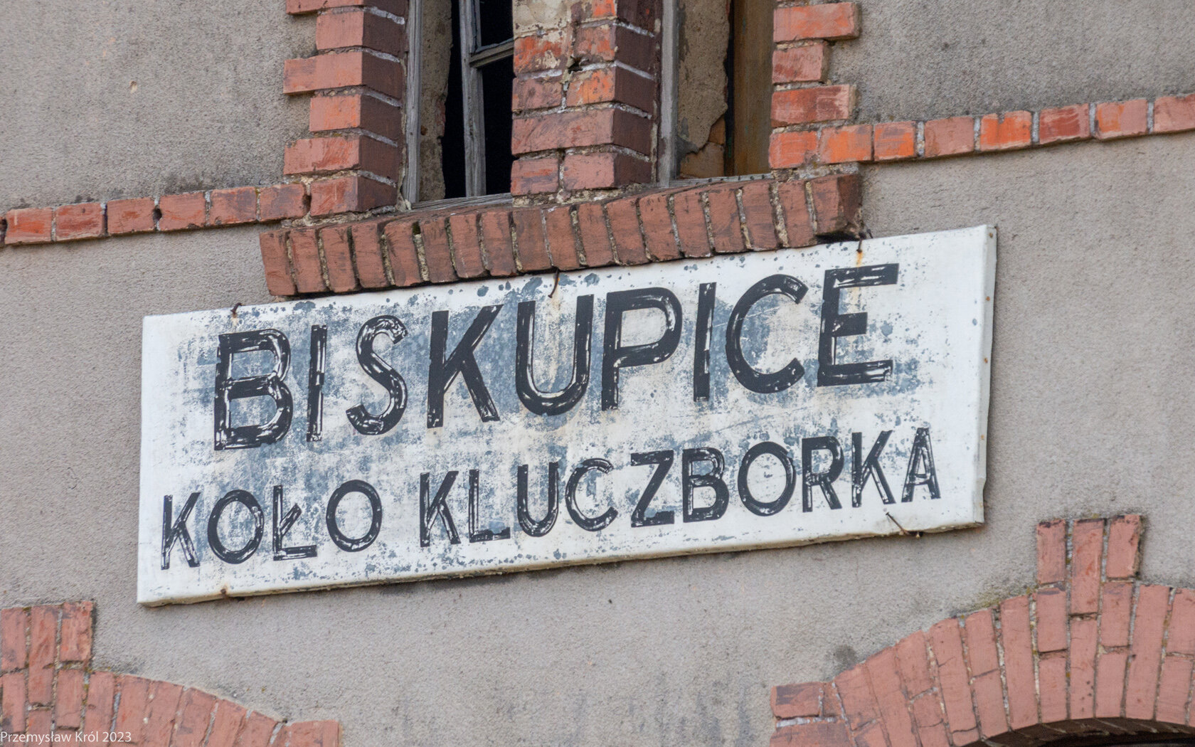 Tablica z nazwą przystanku kolejowego na budynku dawnego dworca.