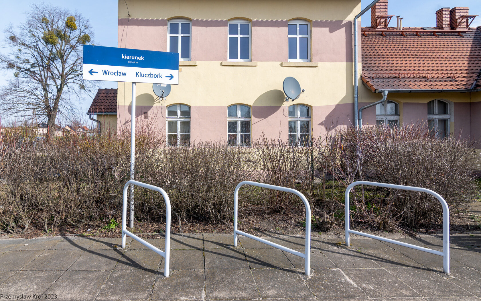 Tablica kierunkowa oraz stojaki na rowery, wszystko na pierwszym peronie.