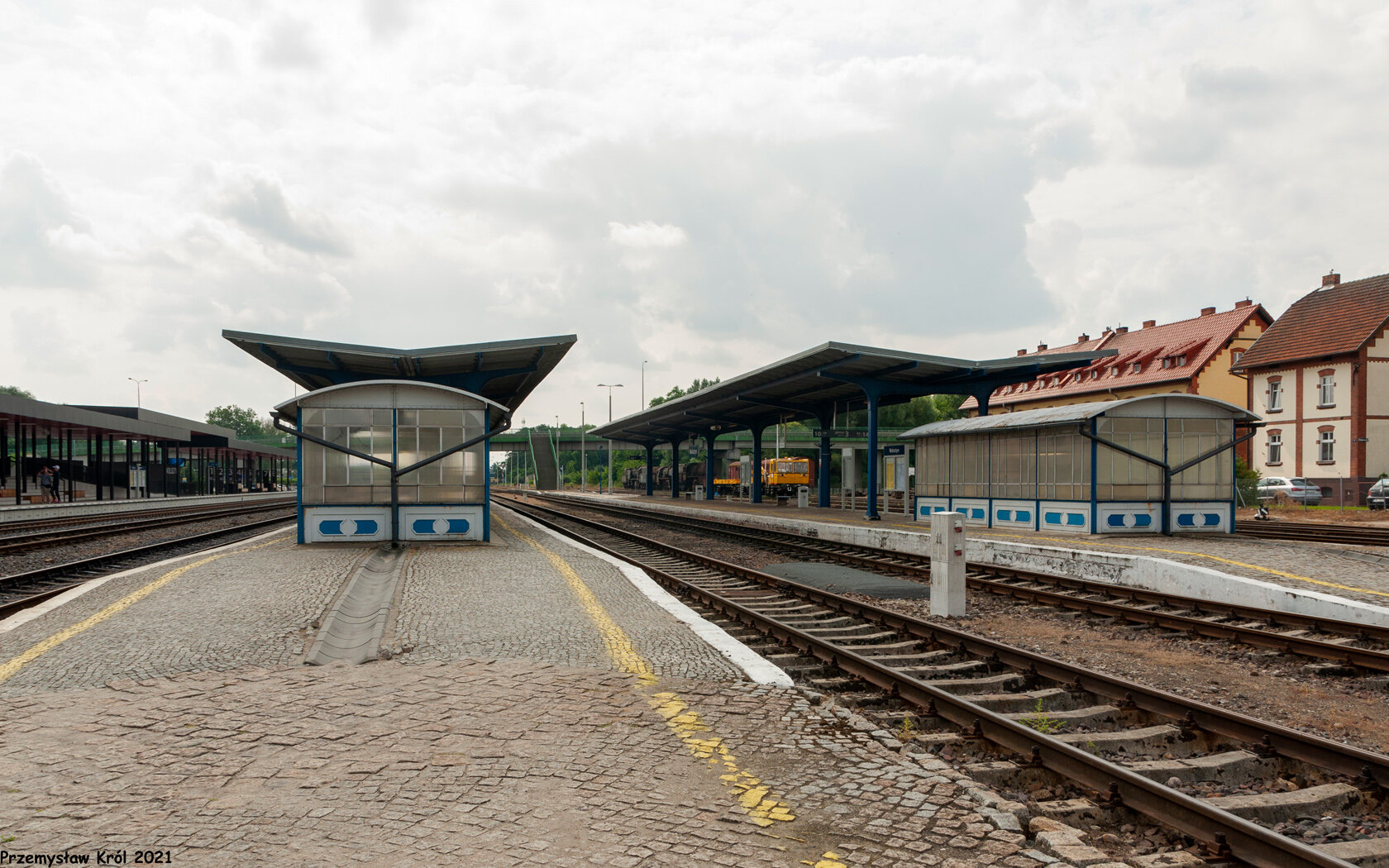 Widok w stronę wschodniego końca peronu, obok widok na numerowane stanowiska odjazdu autobusów.