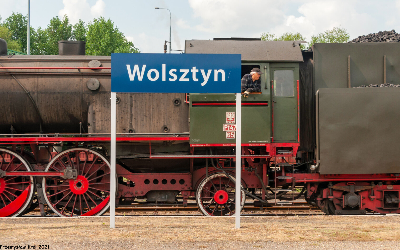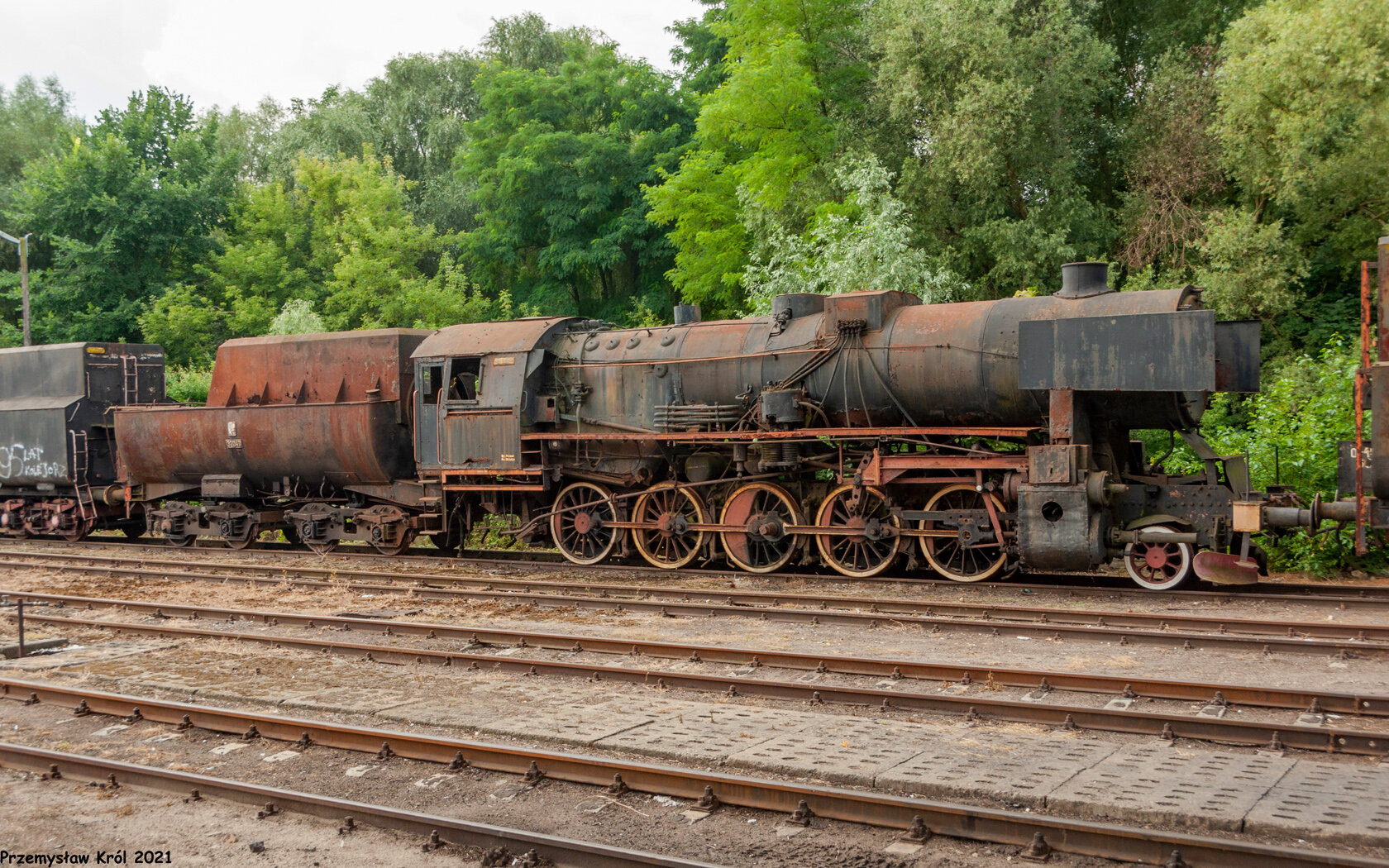 Pośpieszny parowóz serii Pt47 skończył swoją służbę i stoi na bocznym torze stacji Wolsztyn.