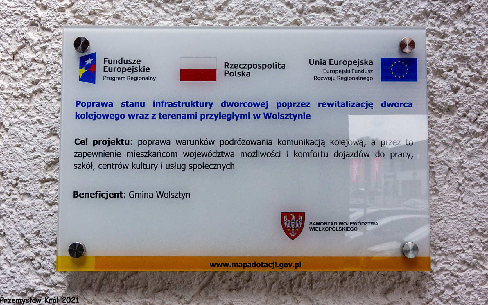 Tablica odnosząca się do uzyskanych środków przeznaczonych na remont dworca w Wolsztynie.