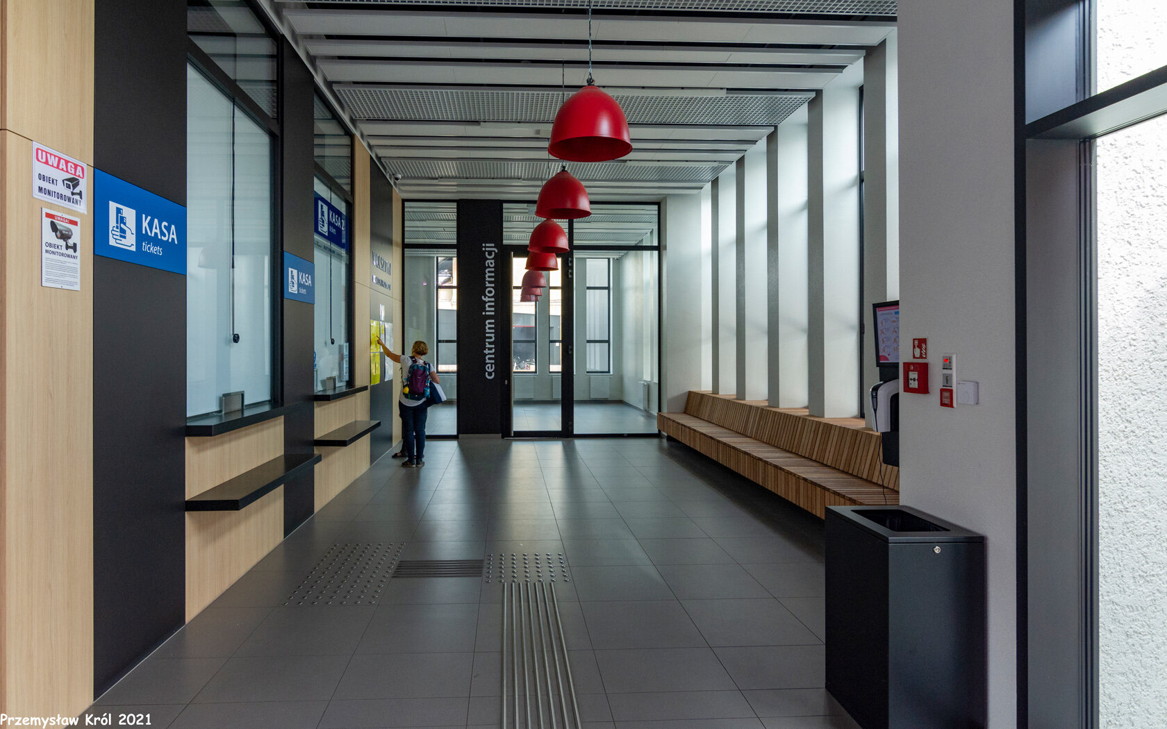 Wnętrze dworca, tu znajdują się kasy biletowe.