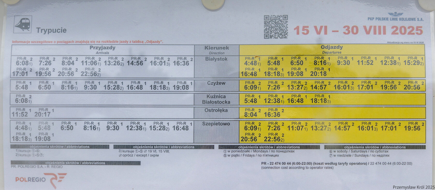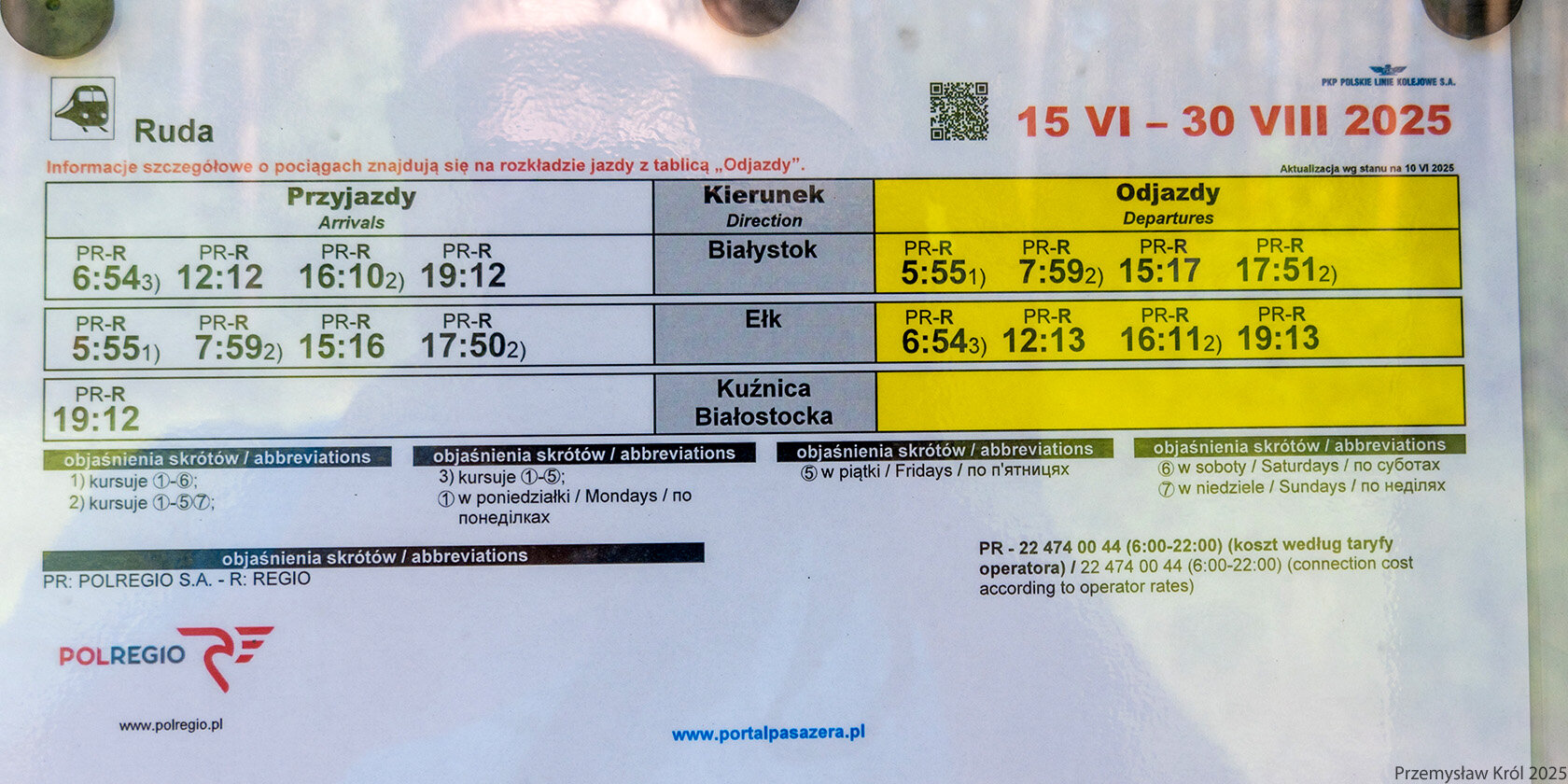Rozkład jazdy wiszący na stacji Podlasek, niby ważna linia Rail Baltica, a pociągów jak na lekarstwo.