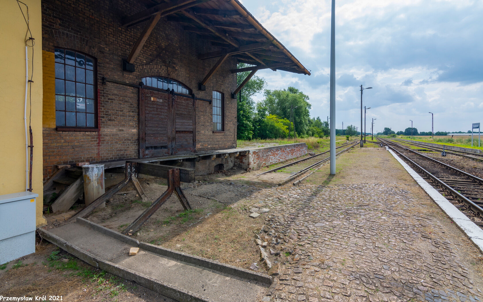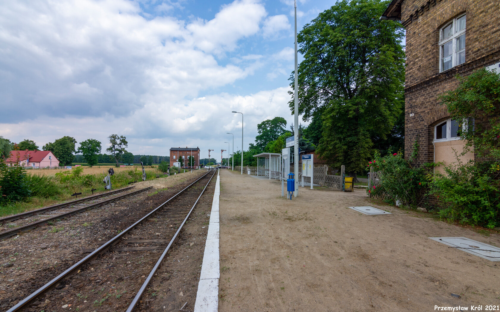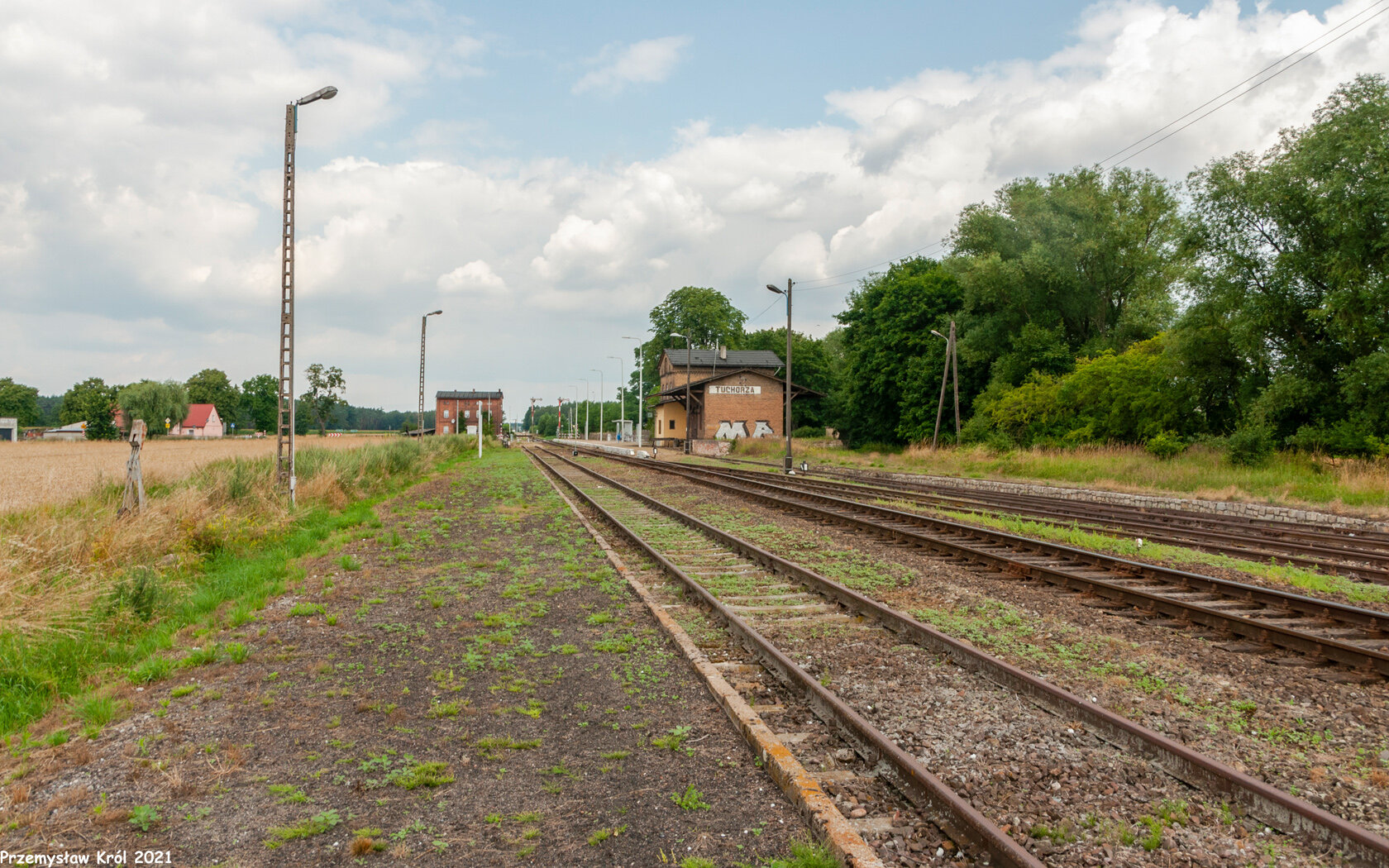 Kadr z drugiego peronu na budynek dworca, część kolejowa dawno została opuszczona, część mieszkalna stacji nadal jest używana.