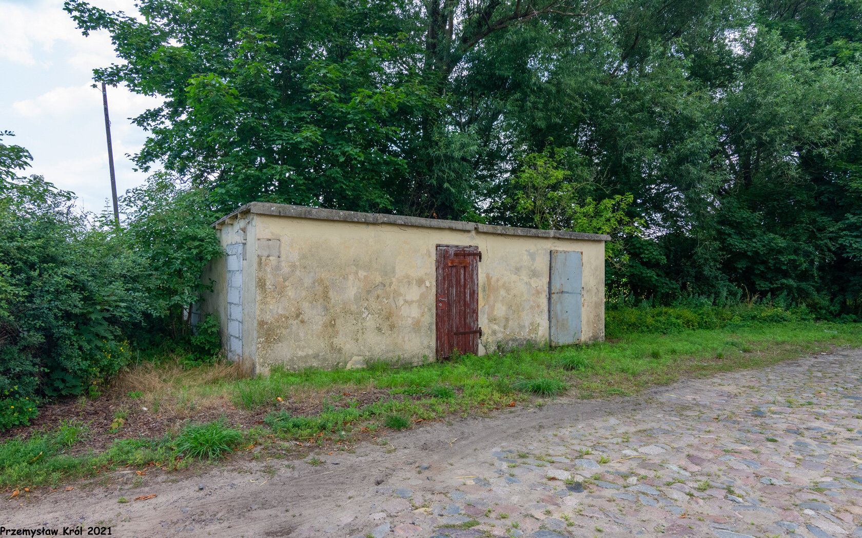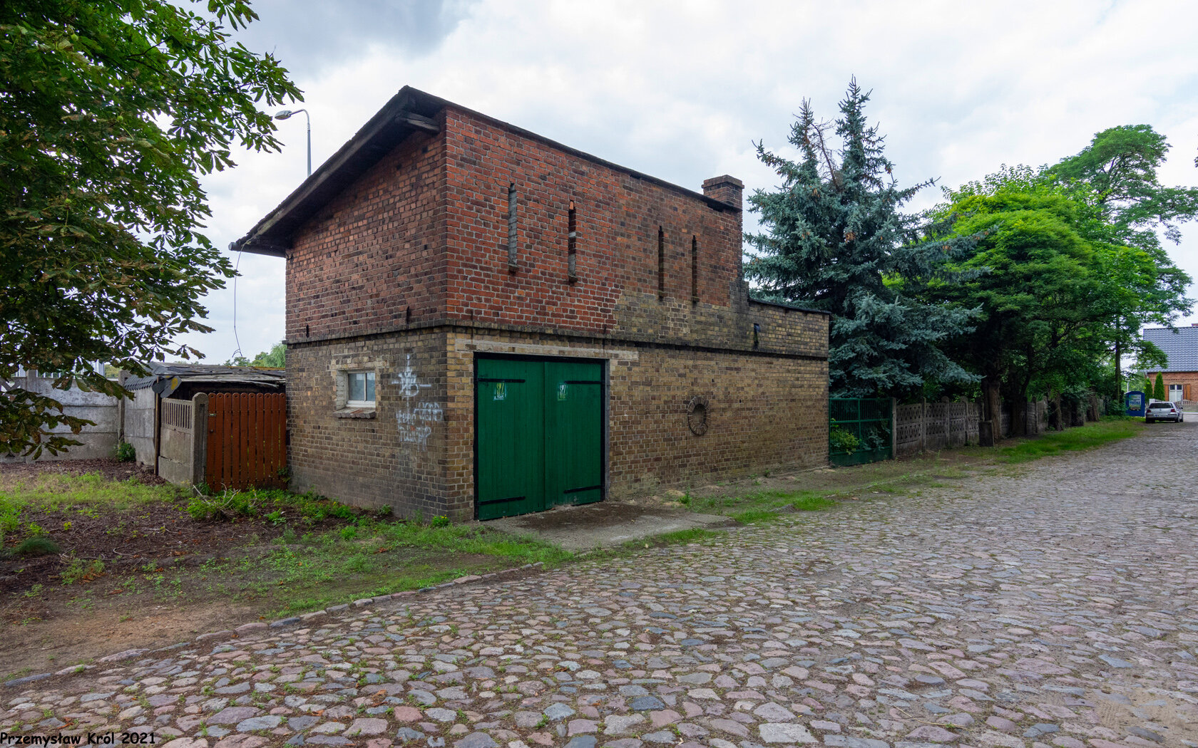 Dawny kolejowy budynek mieszkalny za przejazdem, o tym że jest to budynek, który został wybudowany w czasie oddania stacji do użytkowania świadczy ta sama cegła co pozostałe zabudowania dworcowe oraz napis z nazwą stacji.