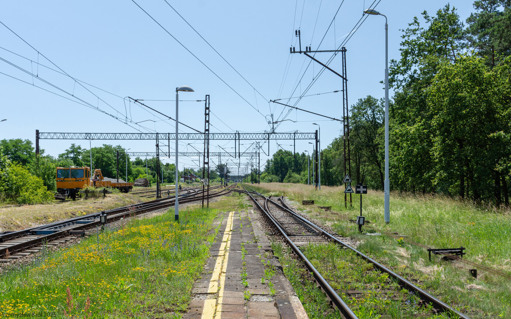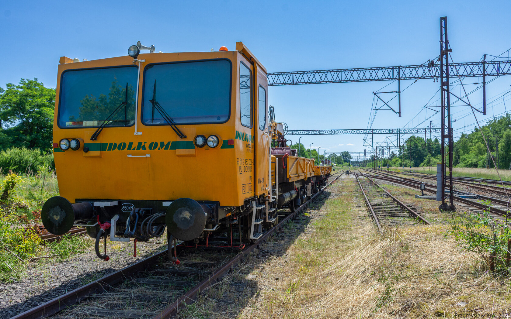 Odstawiona na niezelektryfikowany boczek drezyna spółki Dolkom, prawdopodobnie to ta spółka wykonuje remont pierwszego toru.