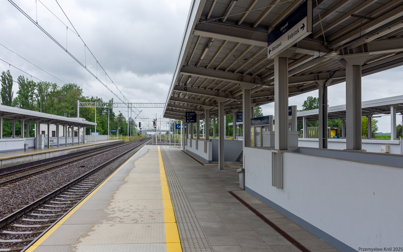 Drugi peron i podwieszona tablica kierunkowa wskazująca kierunki jazdy na Białystok i Warszawę.