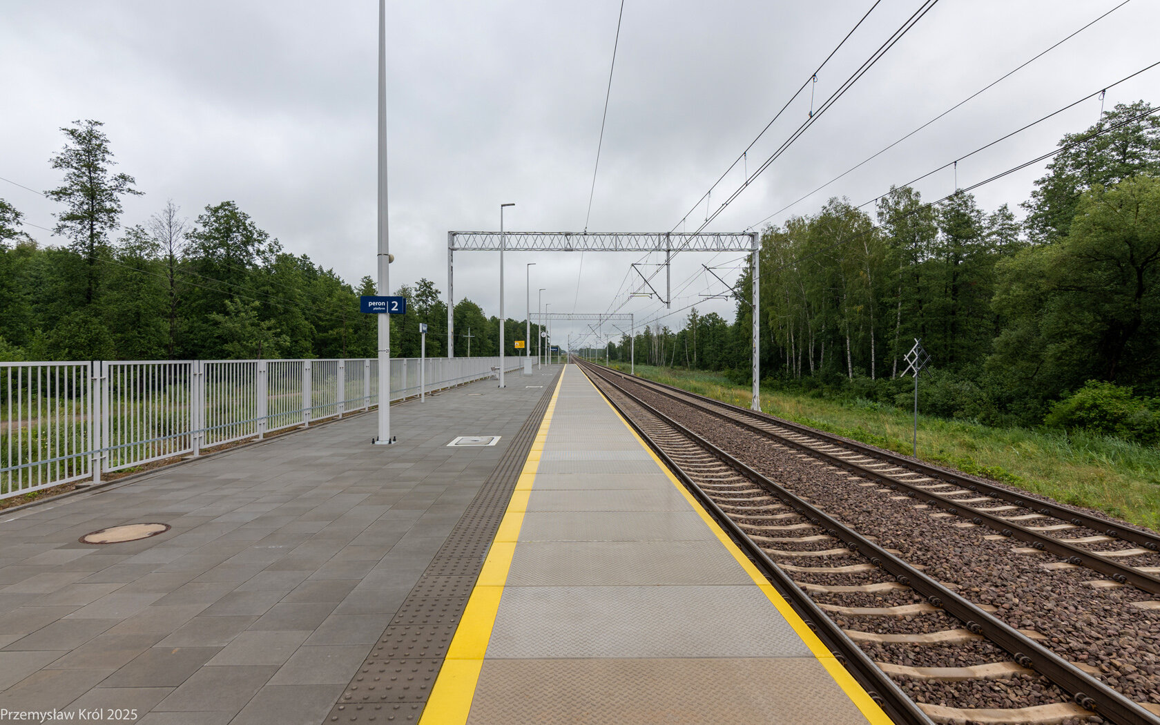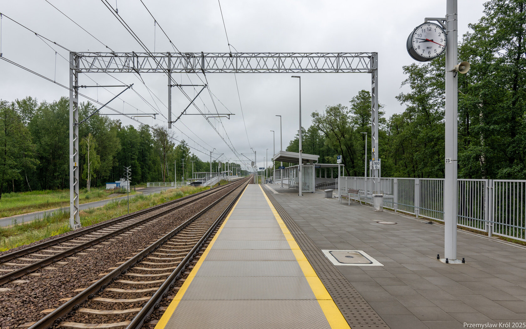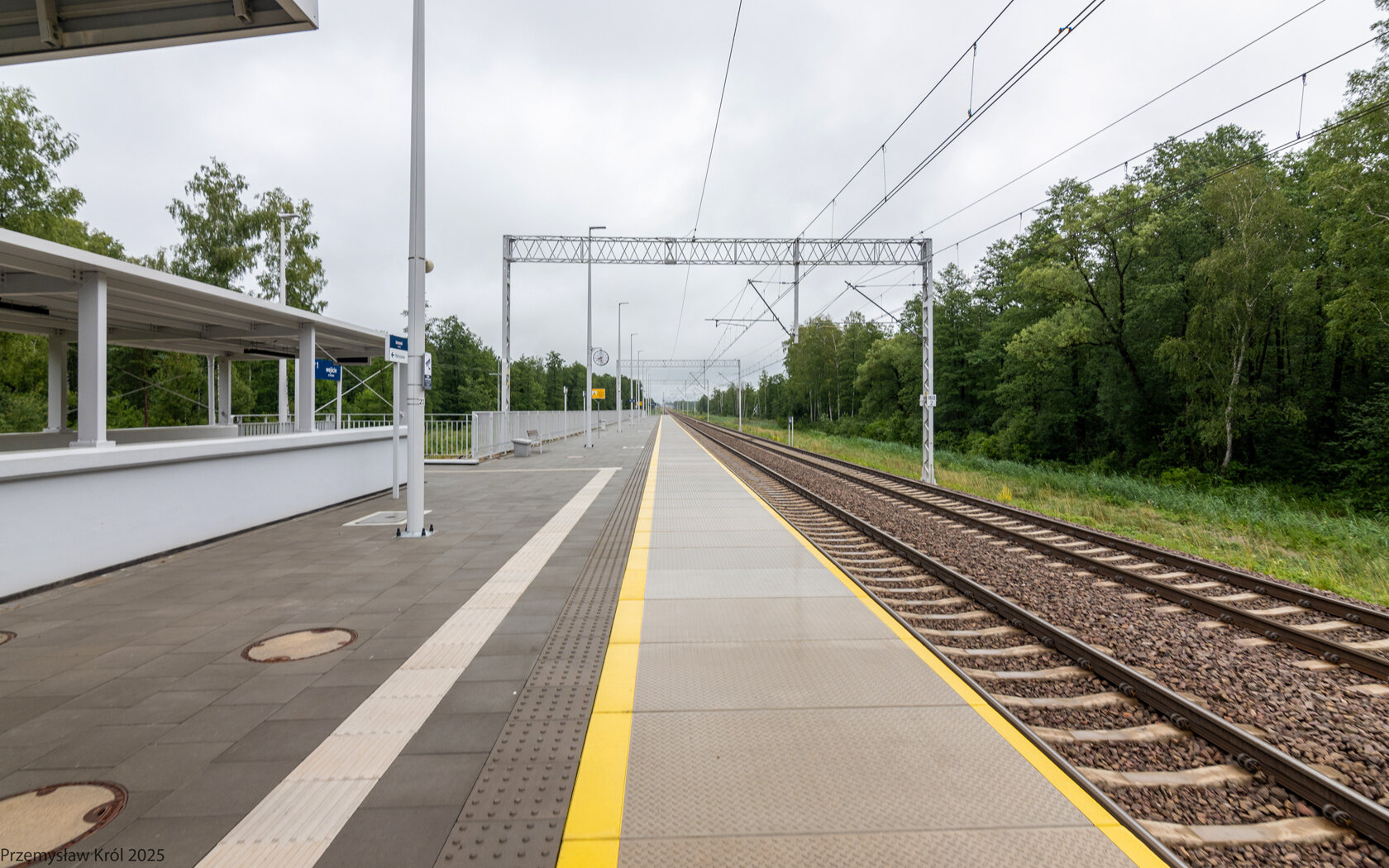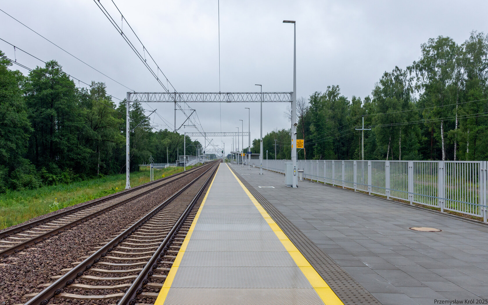 Ujęcie pokazujące cały pierwszy peron przystanku osobowego.