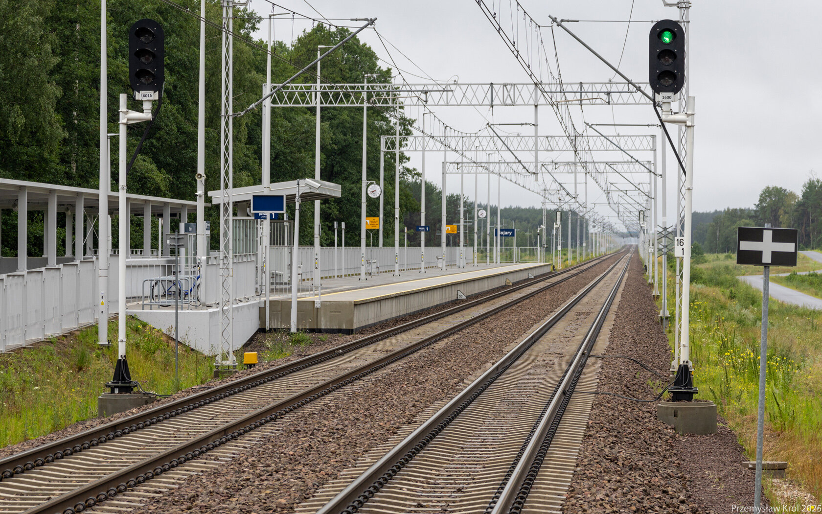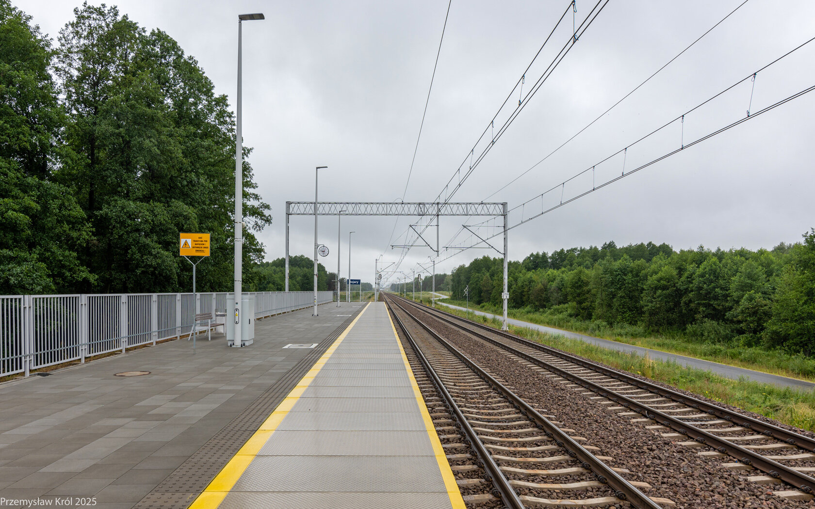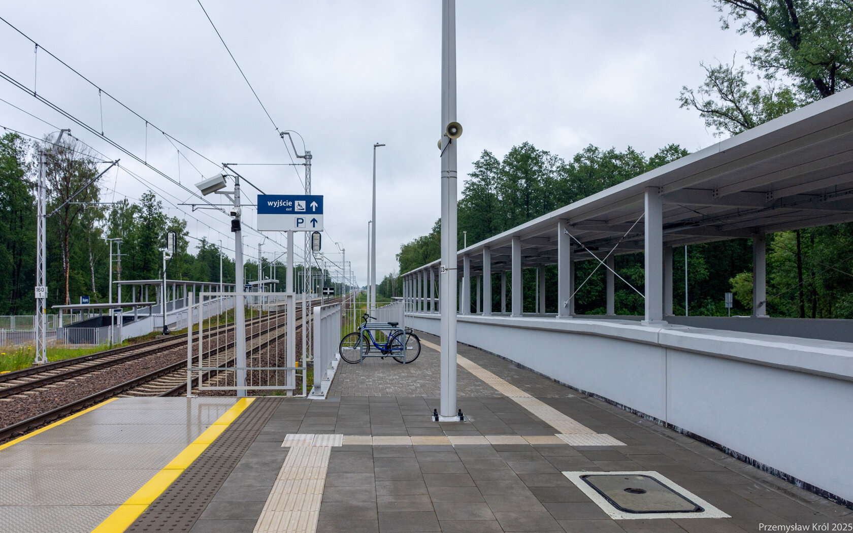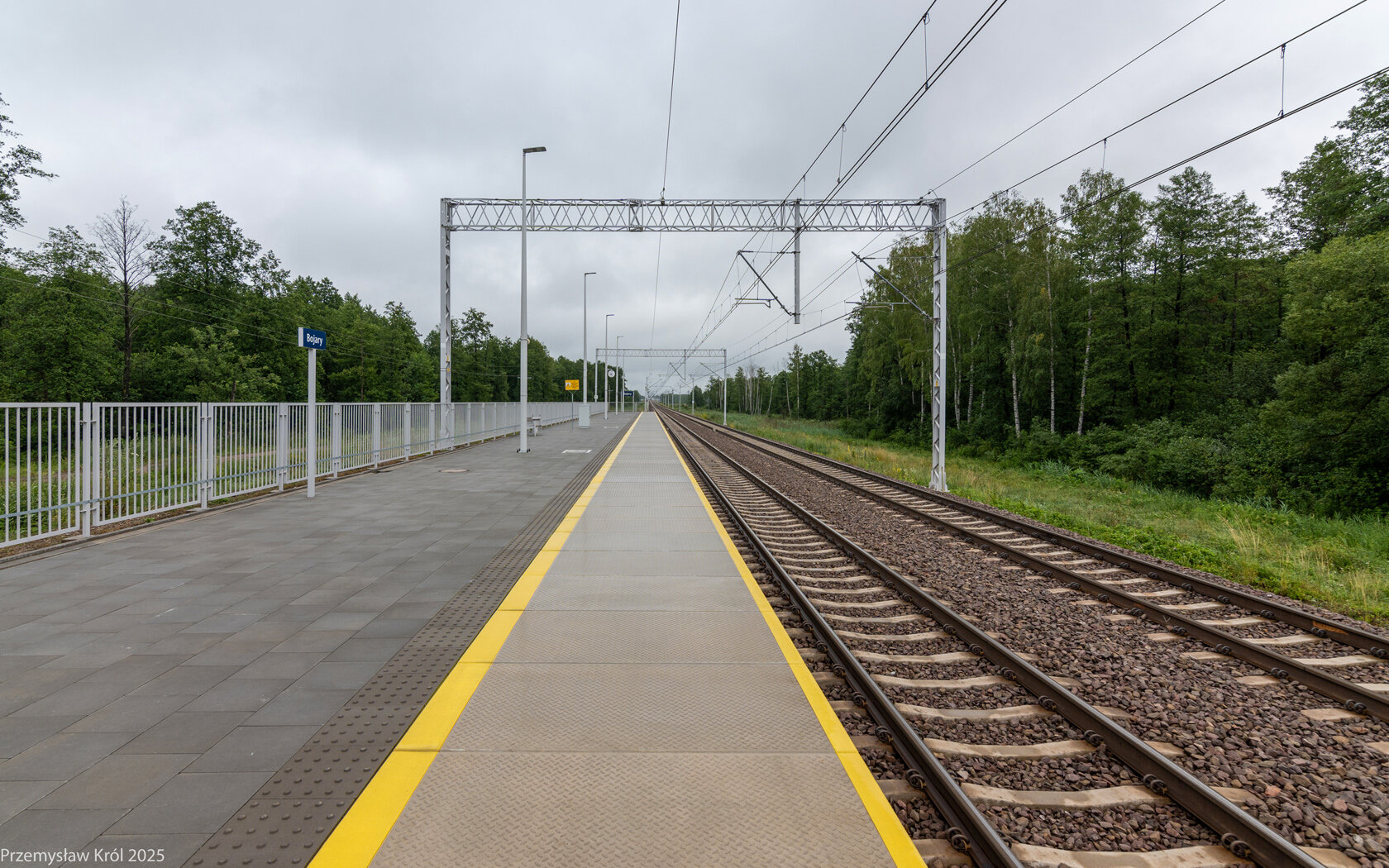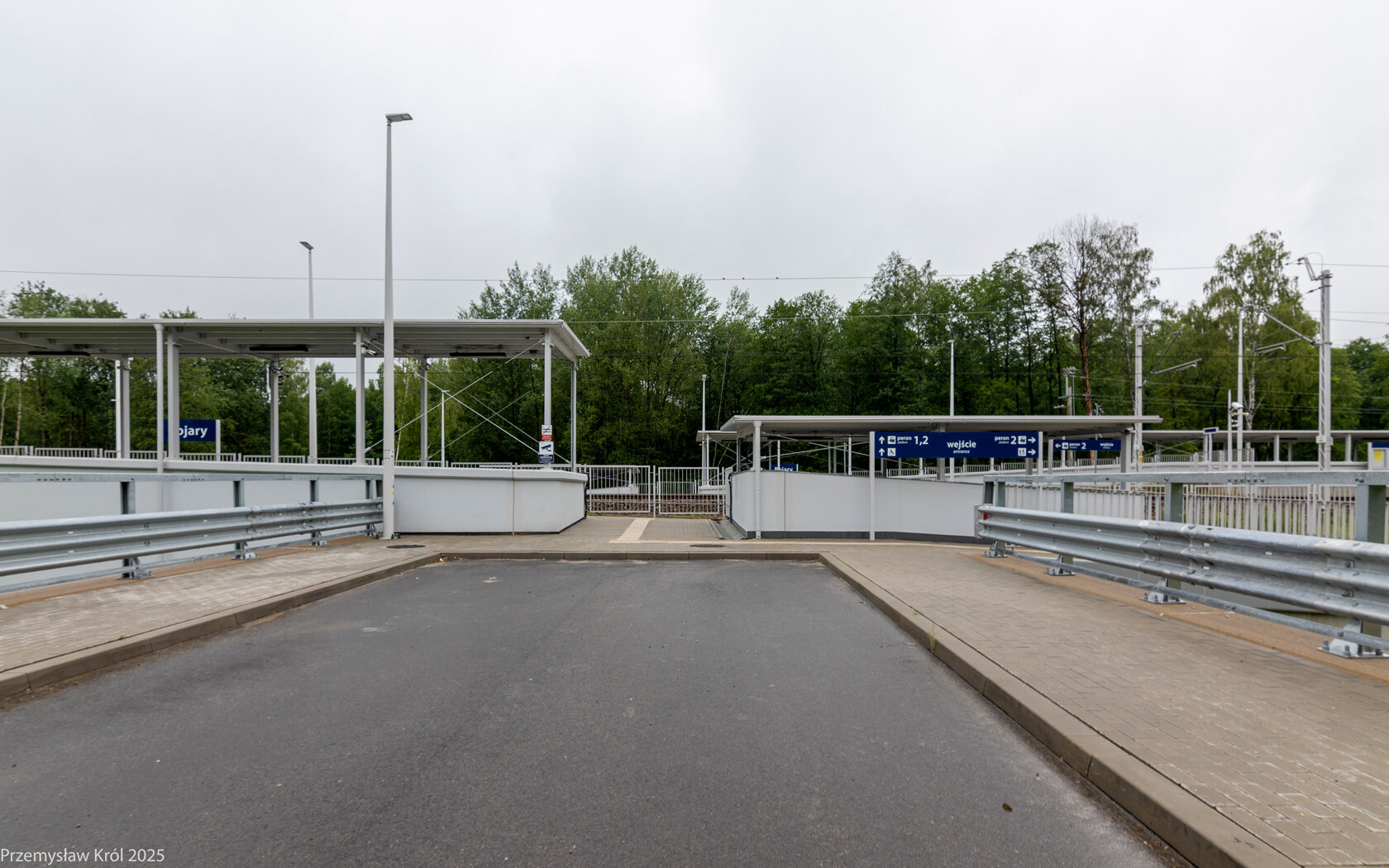 Ujęcie pokazujące cały pierwszy peron przystanku osobowego.