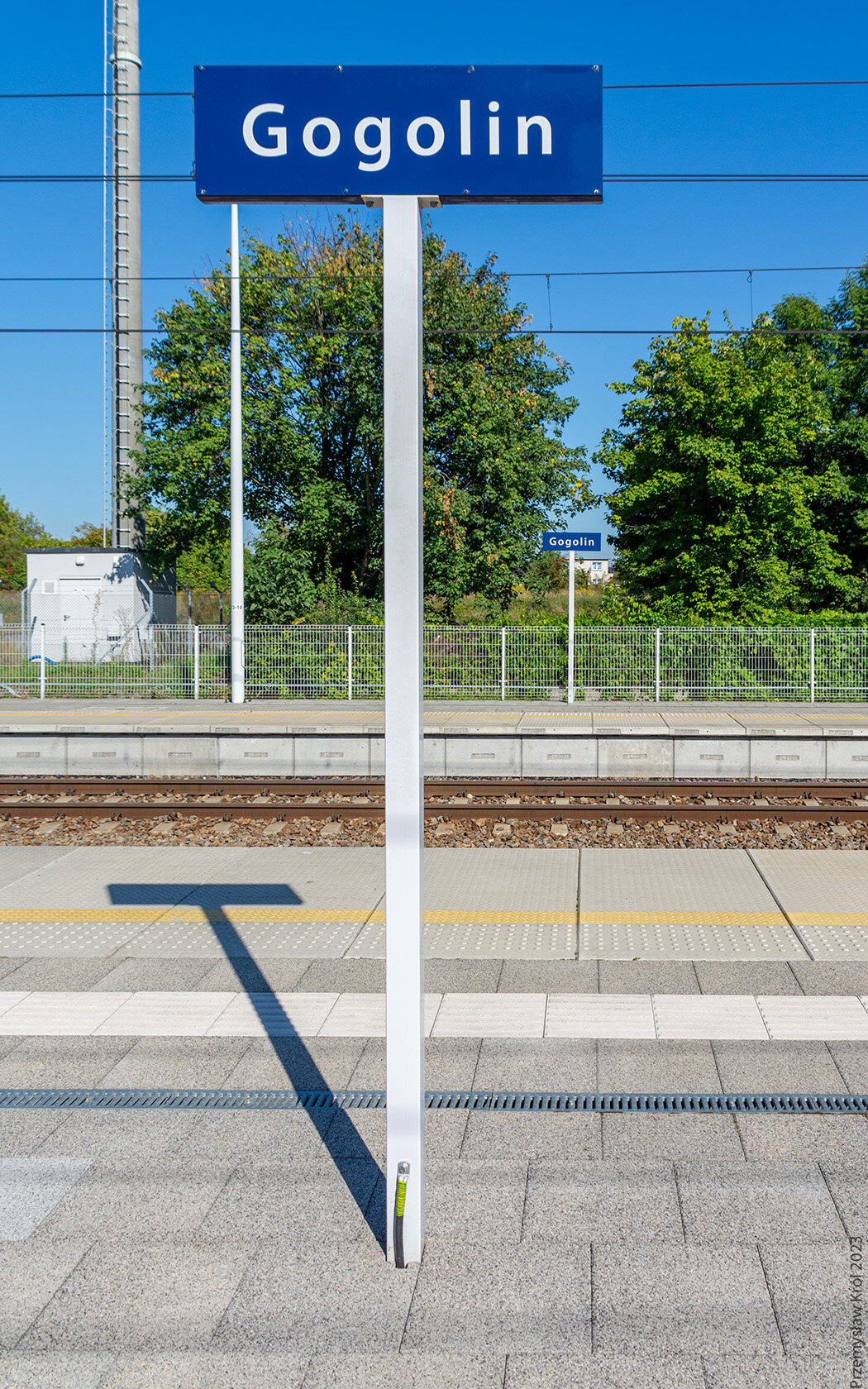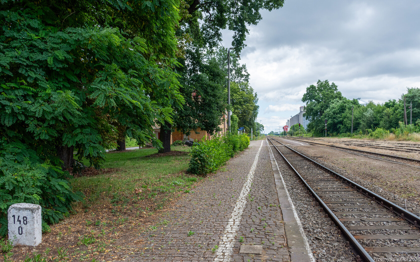 Przy pierwszym peronie jest słupek hektametrowy wskazujący odległość od początku linii, w tym wypadku jest to 148 kilometrów od Katowic.