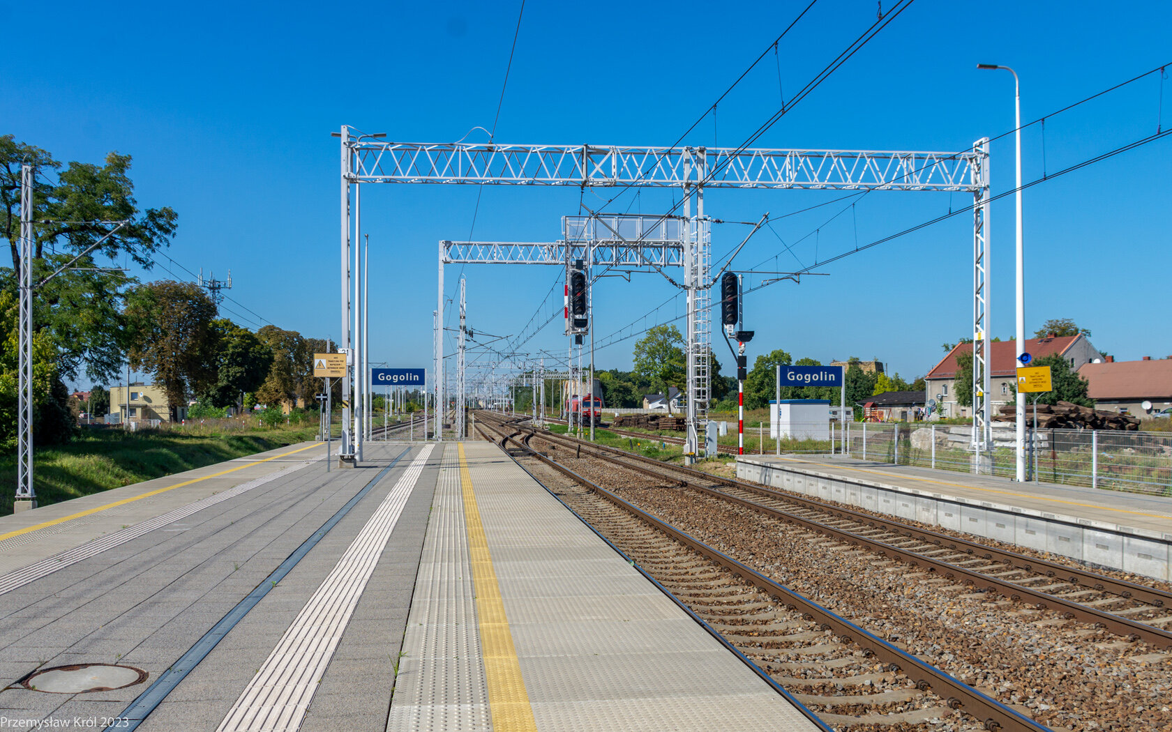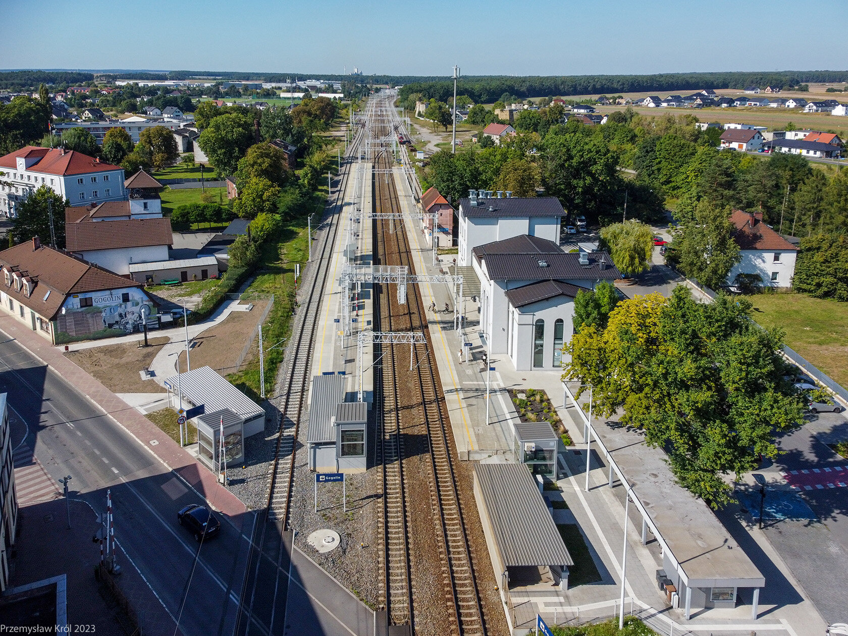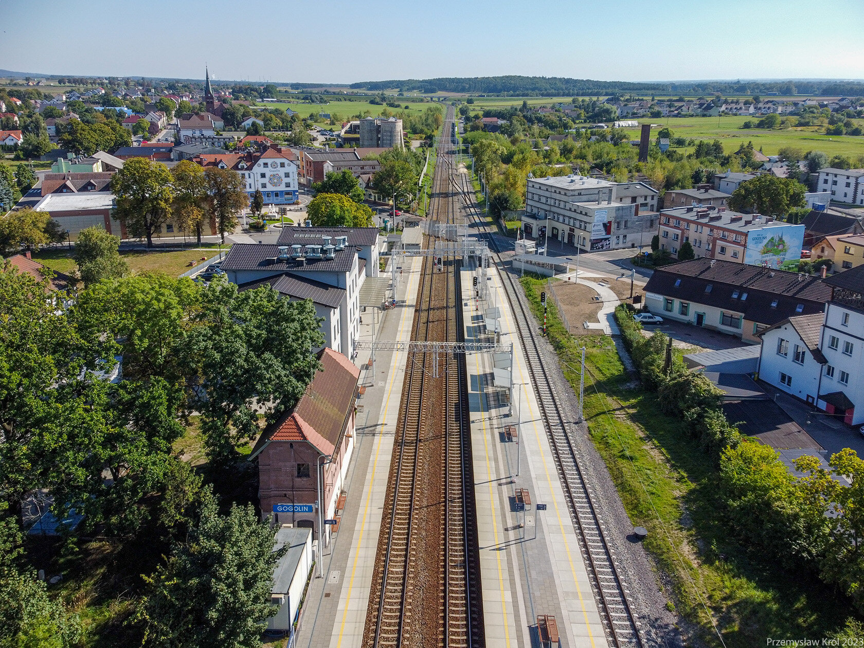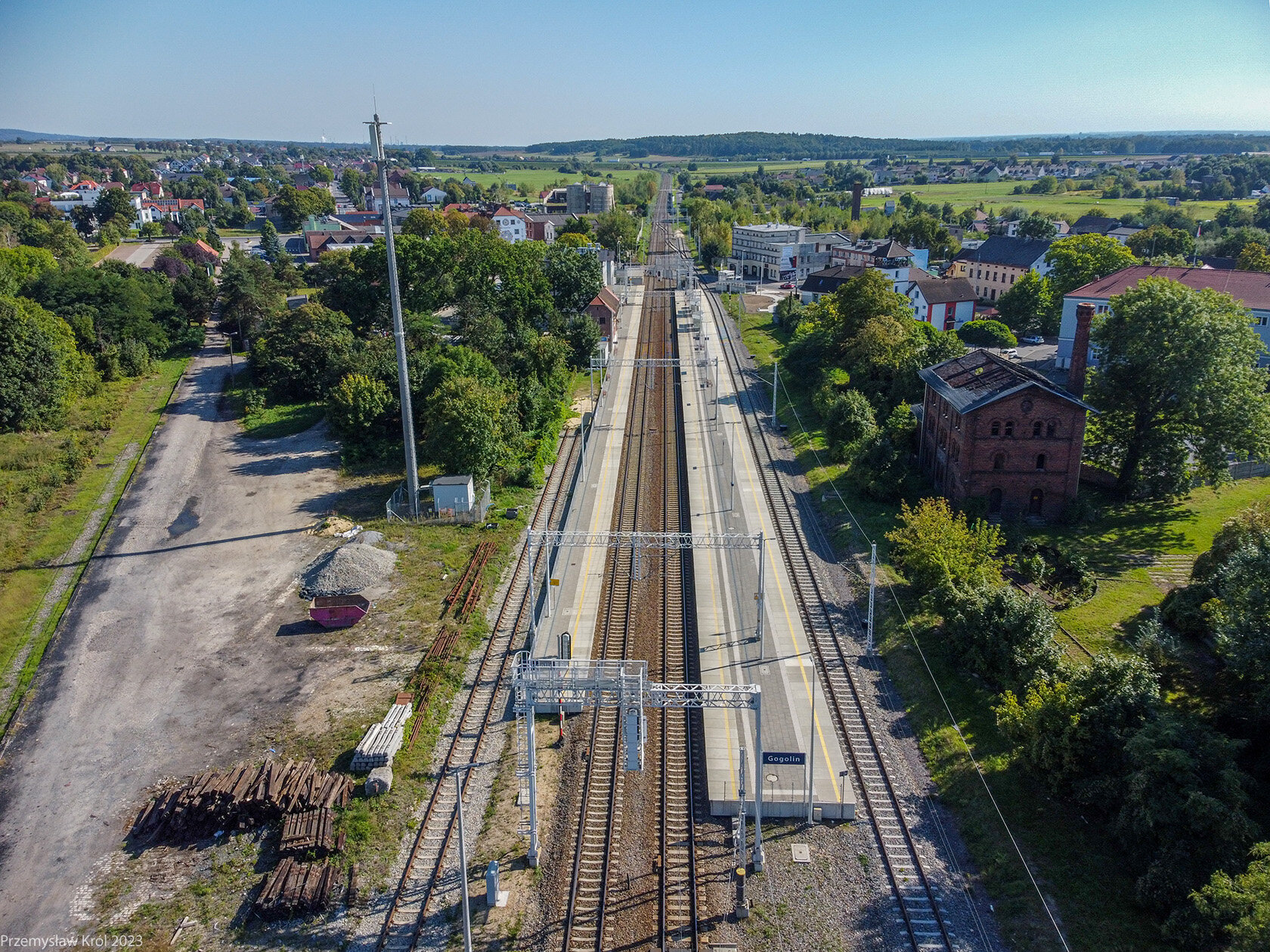 Ujęcie lotnicze na perony stacji w Gogolinie od strony północnej na południe.