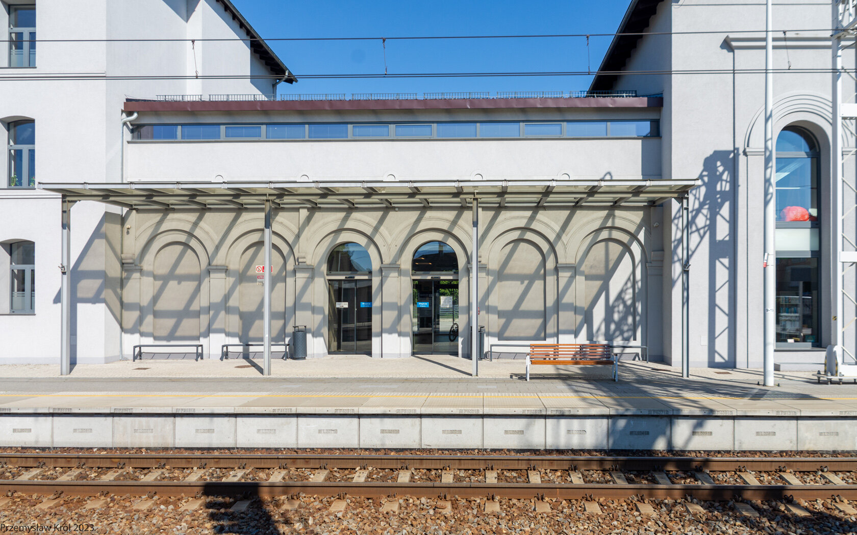 Widok na wejście do budynku dworca od strony pierwszego peronu.