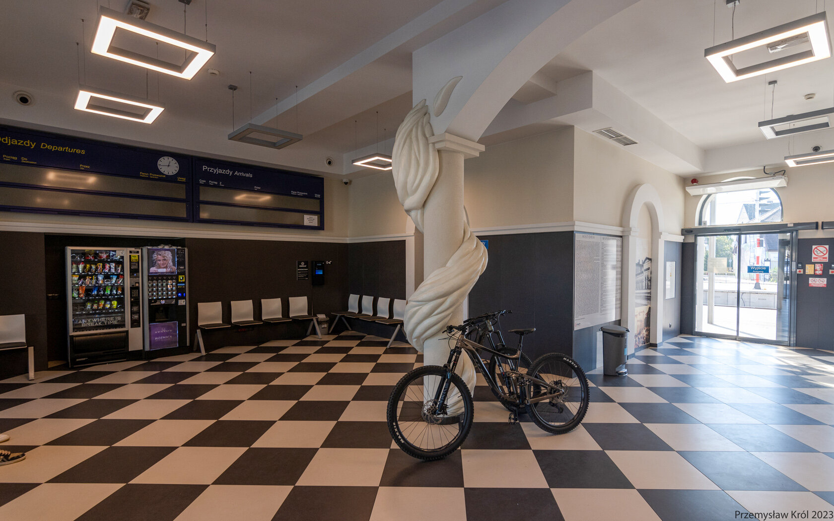 Ciekawe wykończenie kolumny wewnątrz budynku dworca. Obok znajdują się choć automaty z przekąskami.
