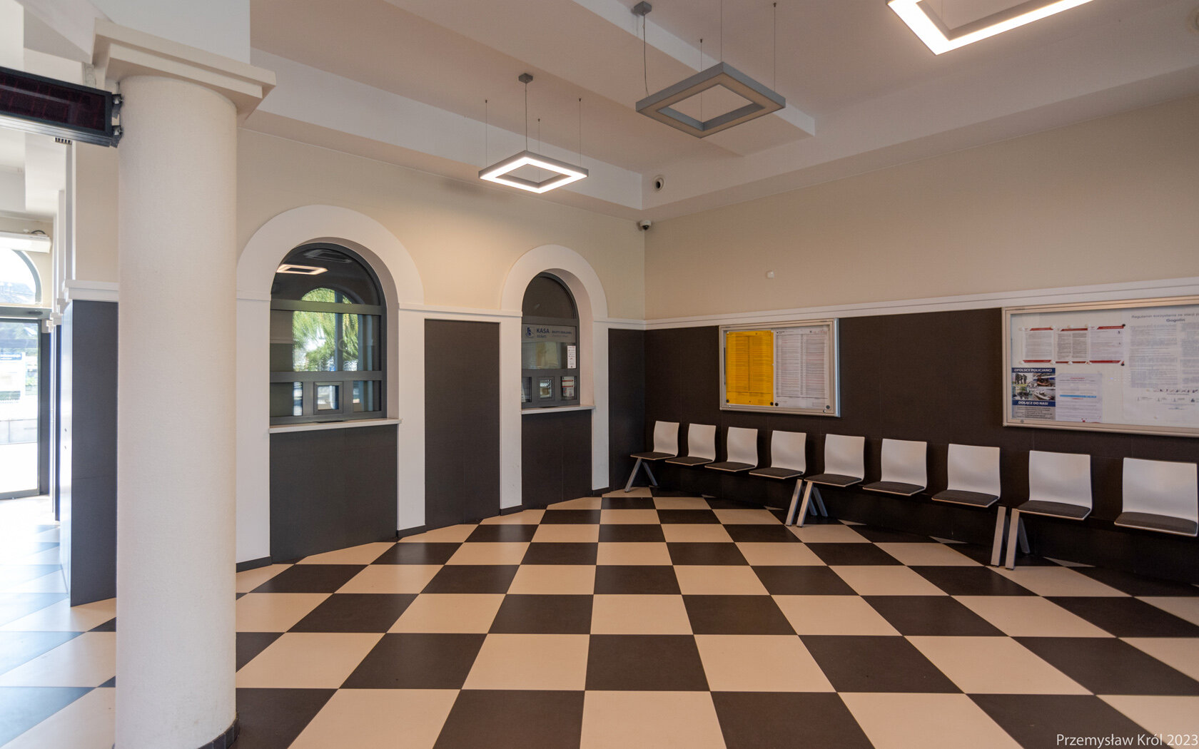 Wnętrze dworca kolejowego, ujęcie w kierunku wyjścia do miasta.