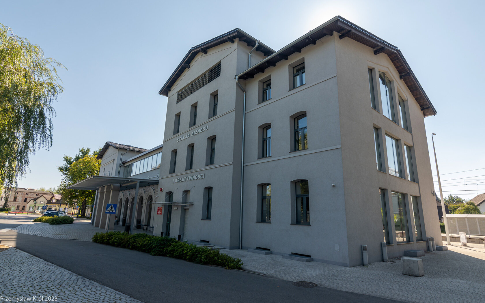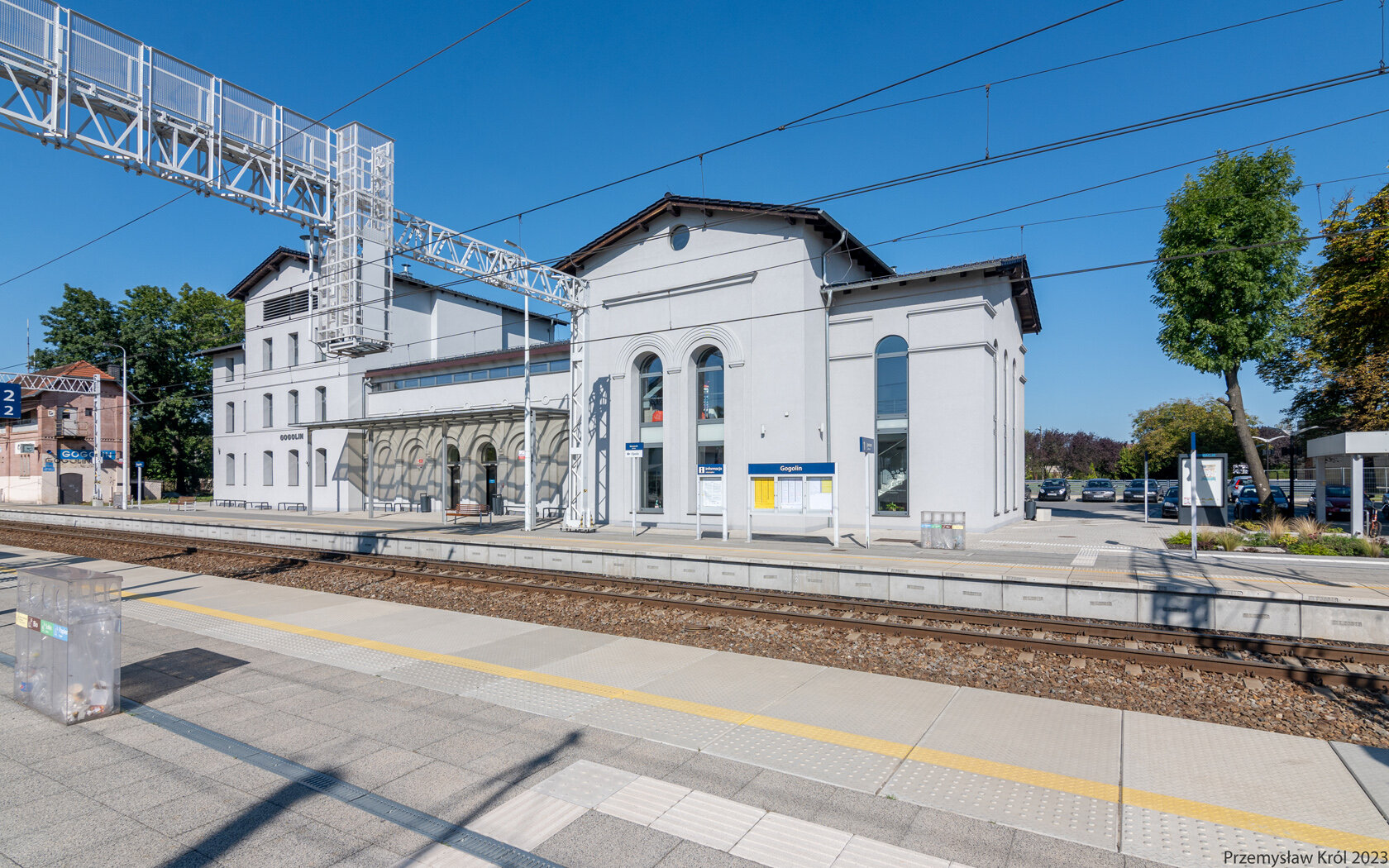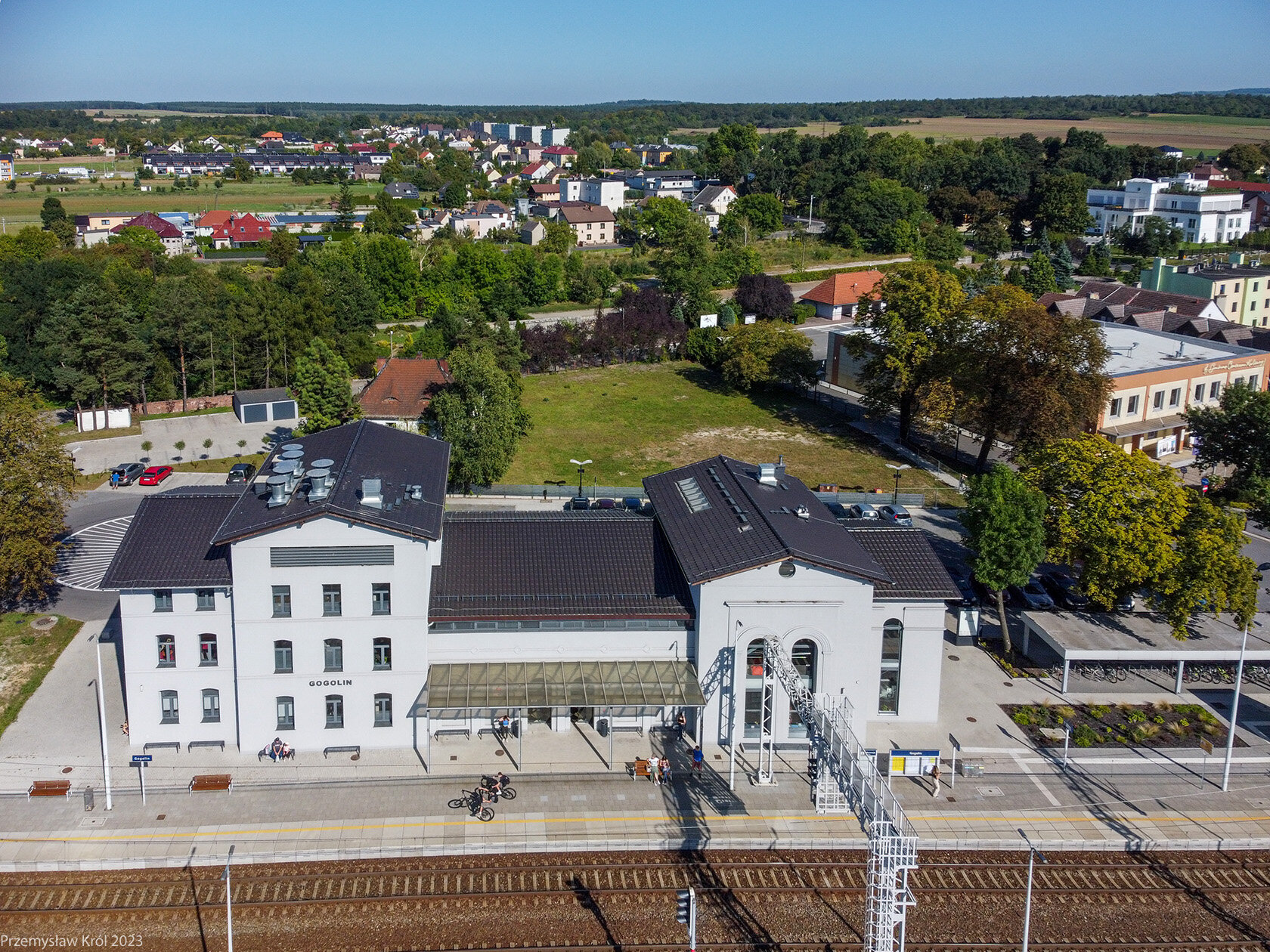 Widok na budynek dworca z góry, bramka sieci trakcyjnej psuje nieco kard na dworzec.