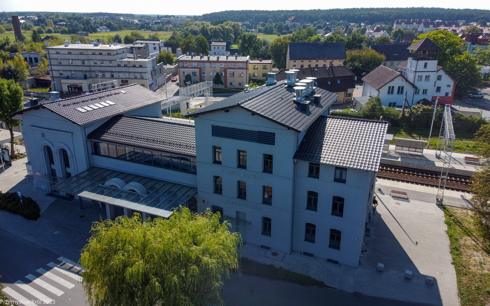 Ujęcie "z góry" na budynek dworca kolejowego.