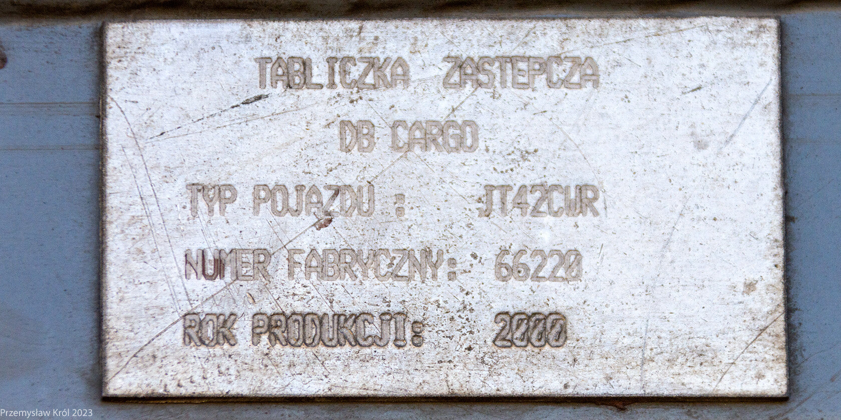 Zastępcza tabliczka znamionowa lokomotywy oznaczanej przeze mnie jako Class 66, jest to JT42CWR. Jednak ja jestem laik i będę oznaczał te lokomotywy jako wspomniana seria "Klasa 66".